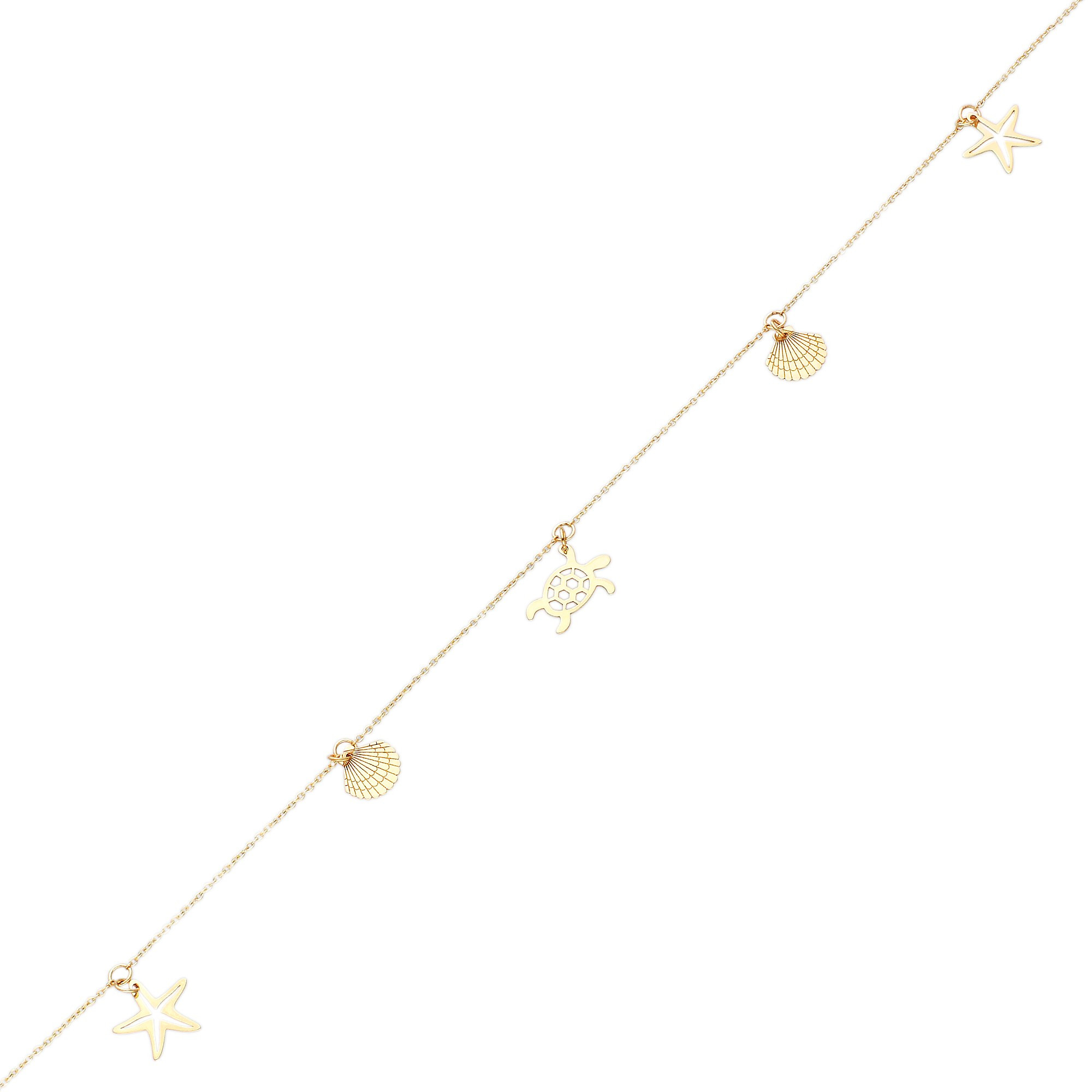 Step into summer with this beautiful 9ct yellow gold anklet, inspired by seaside adventures and sun filled days. Designed with a delicate trace chain, it is adorned with charming beach themed details including a shimmering shell, a dainty starfish and a graceful turtle. Each charm sways gently as you move, capturing the carefree spirit of the coast. Perfect for holidays, beach strolls or simply adding a little sunshine to your everyday style, this gold anklet brings a playful and feminine touch to any outfit. Whether paired with sandals and floaty dresses or layered with other anklets for a personalised look, it is a versatile piece that radiates summer chic. Lightweight and easy to wear, it secures with a simple clasp for comfortable all day elegance. Presented in a smart gift box, it makes a lovely treat for yourself or a thoughtful gift for someone who loves the sea and sunshine.