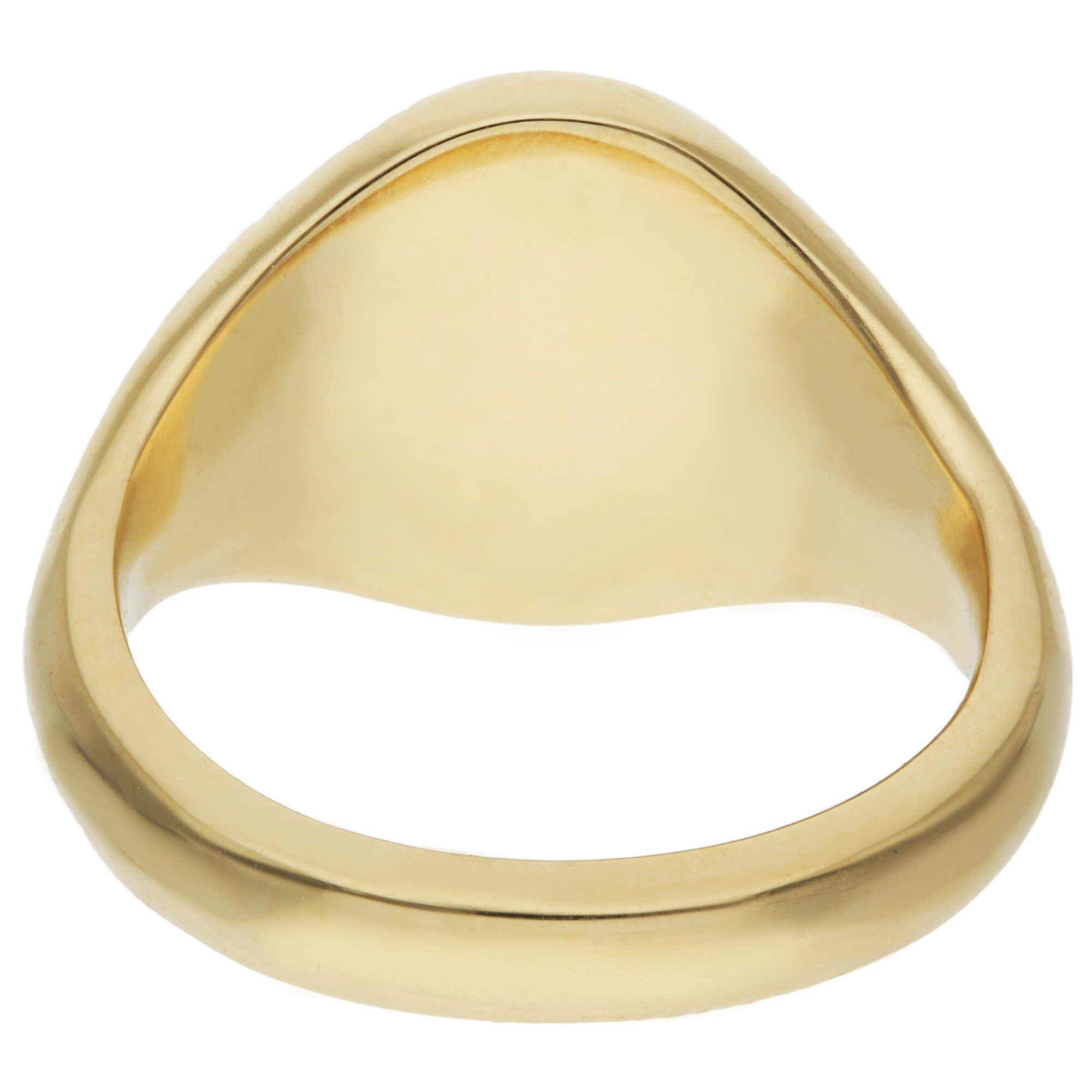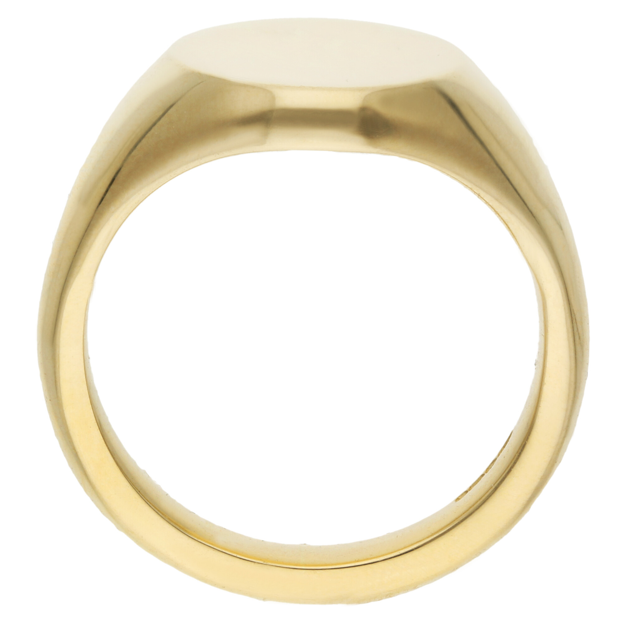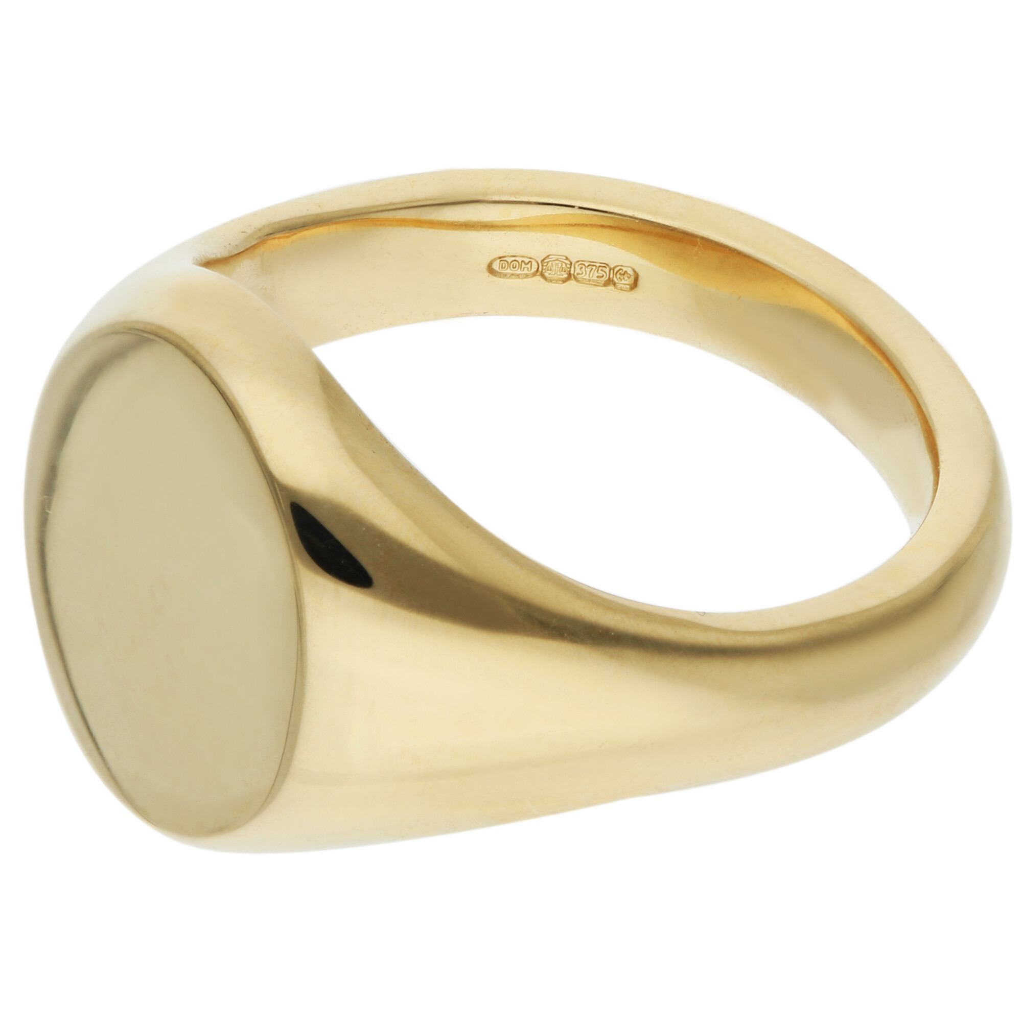 Timeless and elegant, this 9ct yellow gold signet ring is a classic piece of jewellery that never goes out of style. Crafted from solid gold and finished with a high polish, the ring features a smooth round face with a subtle oval shape, offering the perfect surface for engraving a personal initial or meaningful symbol.
