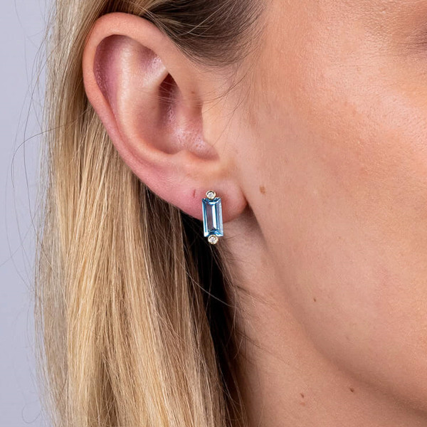 Experience the vibrant elegance of our 9ct Yellow Gold Diamond & 3.70ct Swiss Blue Topaz Earrings, designed for women who appreciate bold beauty. Each earring features a stunning vertical rectangular cut Swiss blue topaz, totalling 3.70ct, with a bezel set diamond on either end, adding a touch of sparkle. Crafted from luxurious 9 carat yellow gold, these stud earrings offer a striking contrast between the vivid blue topaz and the shimmering diamonds. The posts and scroll backs ensure a secure and comfortable fit, perfect for both everyday wear and special occasions. These earrings blend modern sophistication with timeless design, making them a versatile addition to any jewellery collection. Whether you are treating yourself or looking for a thoughtful gift, these diamond and topaz earrings are sure to be cherished. Elevate your style with these exquisite earrings and enjoy the perfect blend of colour and elegance.