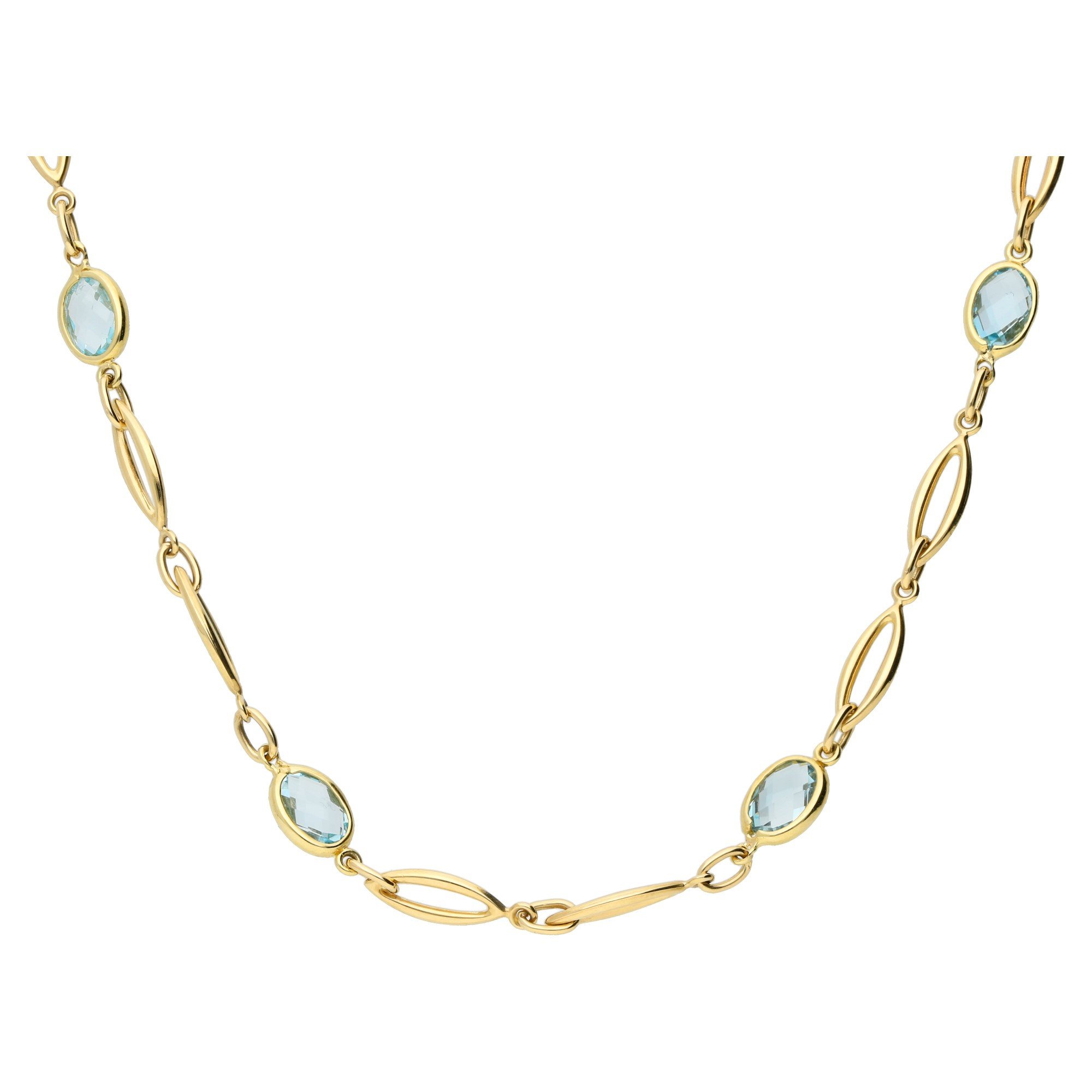 Step into a world of sparkle with this enchanting 9ct yellow gold topaz necklace, a perfect blend of classic elegance and modern charm. This stunning piece features a series of elliptical chain links, each meticulously crafted, and interspersed with beautifully bezel set oval faceted topaz stones. The topaz gems, known for their soothing blue hues, add a captivating pop of colour that complements the warm tones of the yellow gold. This necklace is an excellent choice for adding a touch of luxury to everyday outfits or enhancing evening wear with its understated yet elegant appeal. It makes a thoughtful gift or a cherished addition to any jewellery collection.