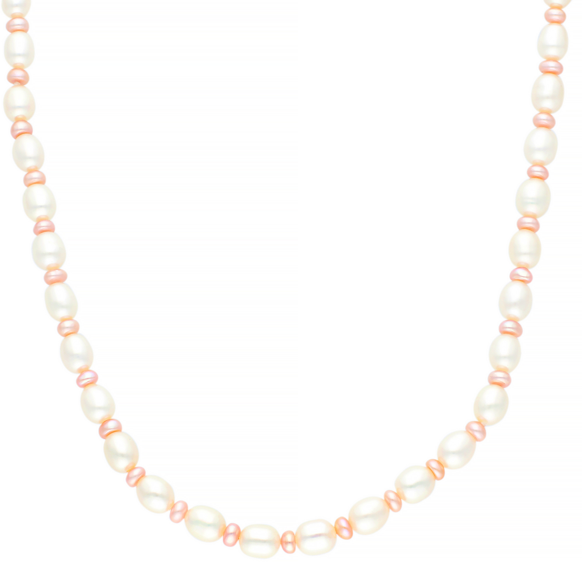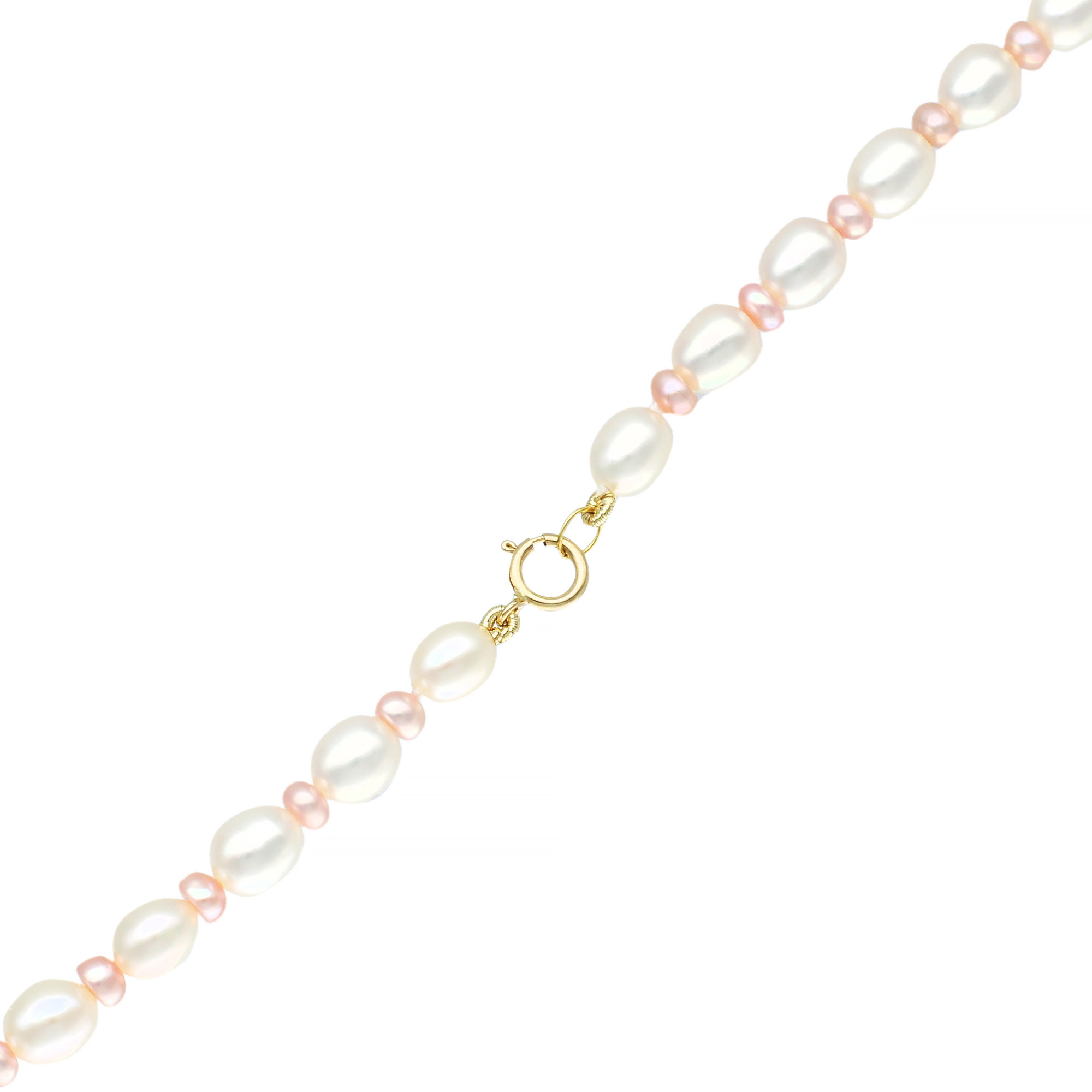 Elevate your jewellery collection with this graceful 9ct yellow gold pearl necklace. Featuring a beautiful arrangement of cultured white rice pearls alternating with delicate smaller cultured pink pearls, this necklace blends classic charm with a touch of modern sophistication. The contrast between the luminous white and soft pink hues creates a captivating design that complements any outfit.