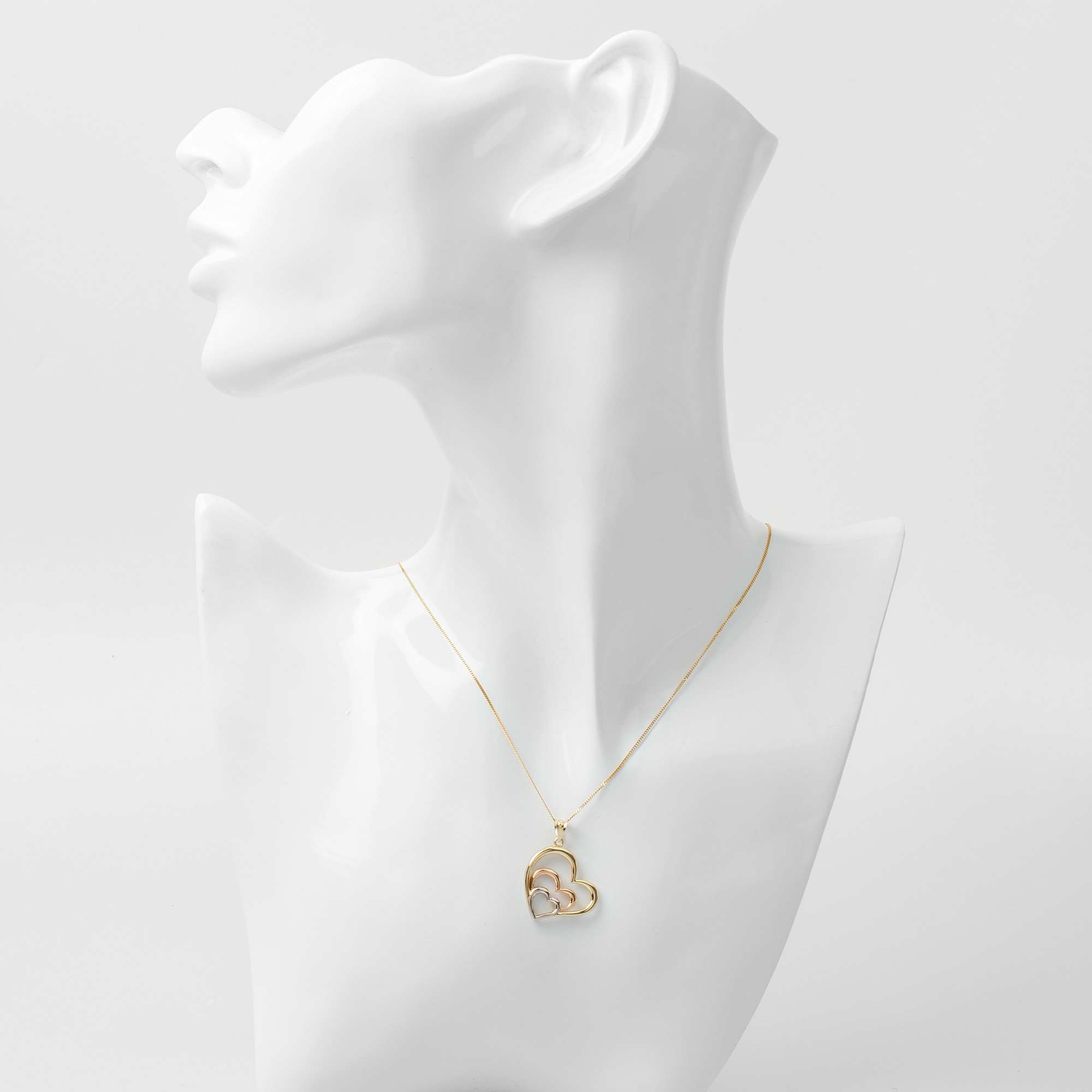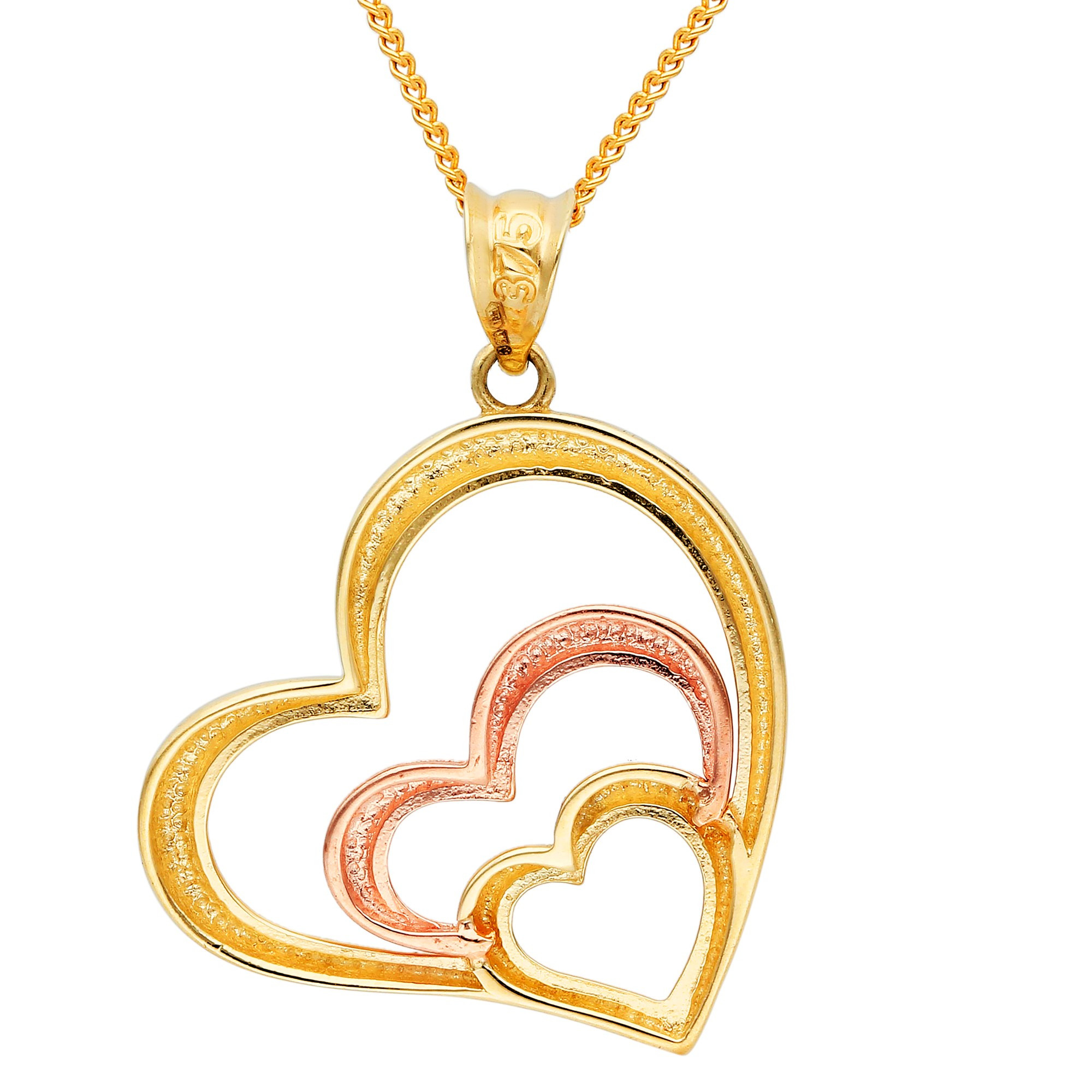Embrace the harmony of elegance with our 9ct Yellow, Rose & White Gold Heart Pendant, a symphony of colours that celebrates love in its purest form. This exquisite pendant showcases a trio of heart designs, each crafted from a different shade of gold - radiant yellow, romantic rose, and sleek white - creating a stunning visual contrast and a piece that's as versatile as it is beautiful. Perfect for the woman who adores the luxury of gold in all its hues, this heart necklace is a testament to craftsmanship and style, making it an ideal accessory for any occasion. Whether you're looking to add a touch of sophistication to your everyday wear or searching for a special gift, this women's heart necklace, with free UK delivery, is a choice that will surely captivate and charm. Shop now and let our Tri-Colour Gold Heart Pendant be a symbol of your refined taste and heartfelt emotions.