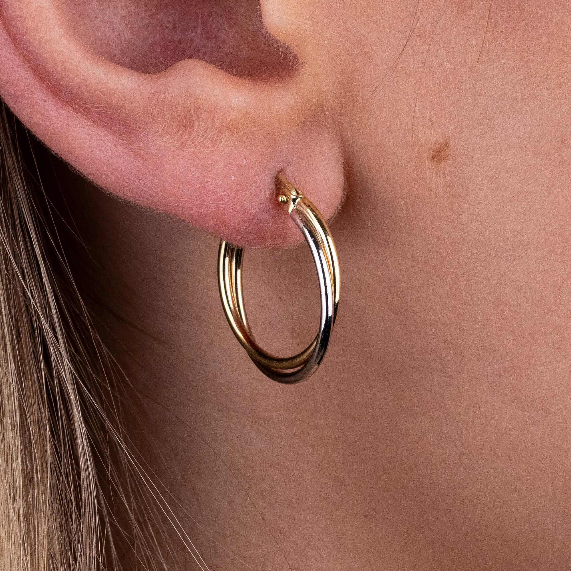 Elevate your style with these exquisite 9ct white and yellow gold hoop earrings, perfect for the modern woman who values both elegance and innovation. Each earring uniquely combines one tube hoop in lustrous white gold with another in rich yellow gold, intricately entwined to create a harmonious blend of colours. The sophisticated design is completed with a secure lever clasp fastening, ensuring that these earrings fit comfortably and securely, suitable for all-day wear. These dual-toned hoops offer a versatile accessory that complements any outfit, making them a must-have addition to your jewellery collection.