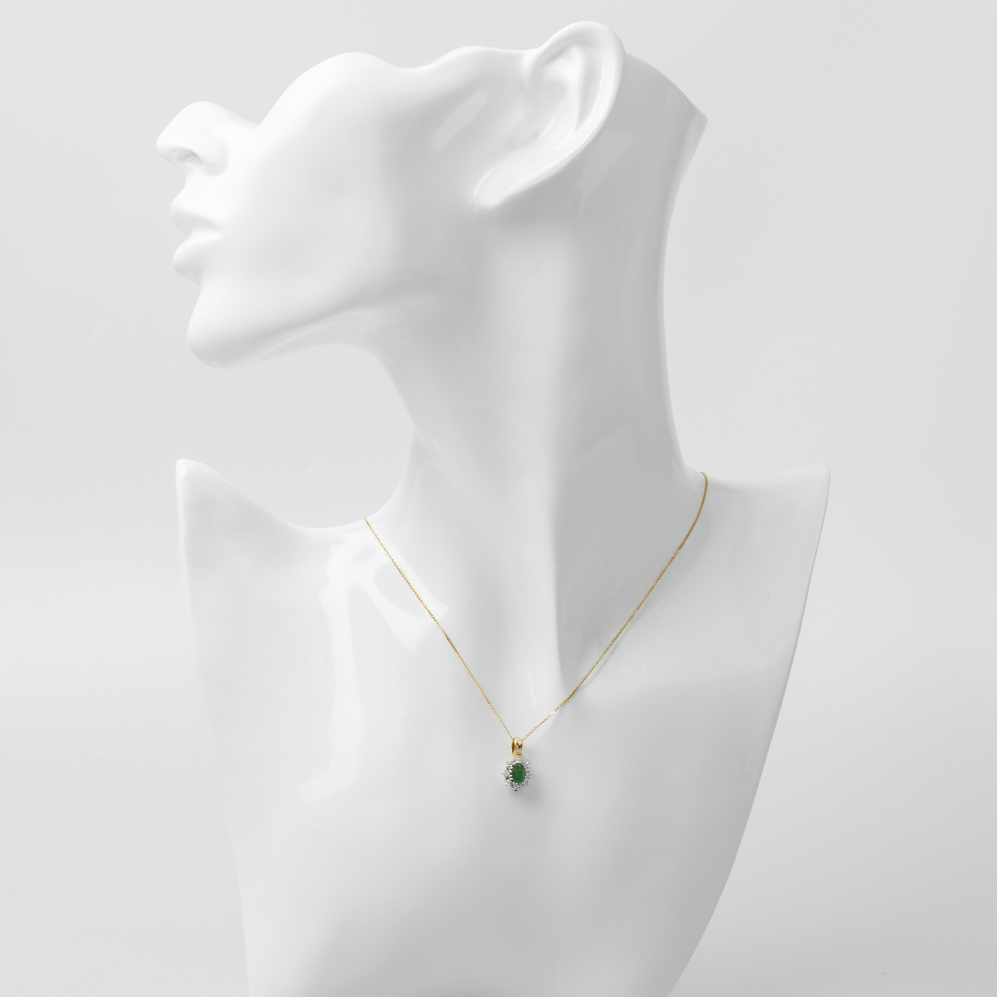 Discover the captivating beauty of our 9ct Yellow Gold Diamond & Emerald Pendant, a piece that exudes elegance and sophistication. This exquisite pendant features a 0.38ct oval emerald, radiating a rich, vibrant green hue that symbolizes renewal and vitality. The emerald is expertly claw-set in a luxurious white gold frame, which is beautifully highlighted by a halo of sparkling diamonds. These diamonds add an extra layer of luminosity and contrast strikingly with the polished yellow gold pendant and bail. Complete with a matching yellow gold chain, this pendant is a stunning choice for those who appreciate the timeless appeal of precious gemstones and the refined allure of meticulously crafted jewellery. Perfect for special occasions or as a significant gift, this emerald and diamond pendant is sure to become a treasured addition to any collection.