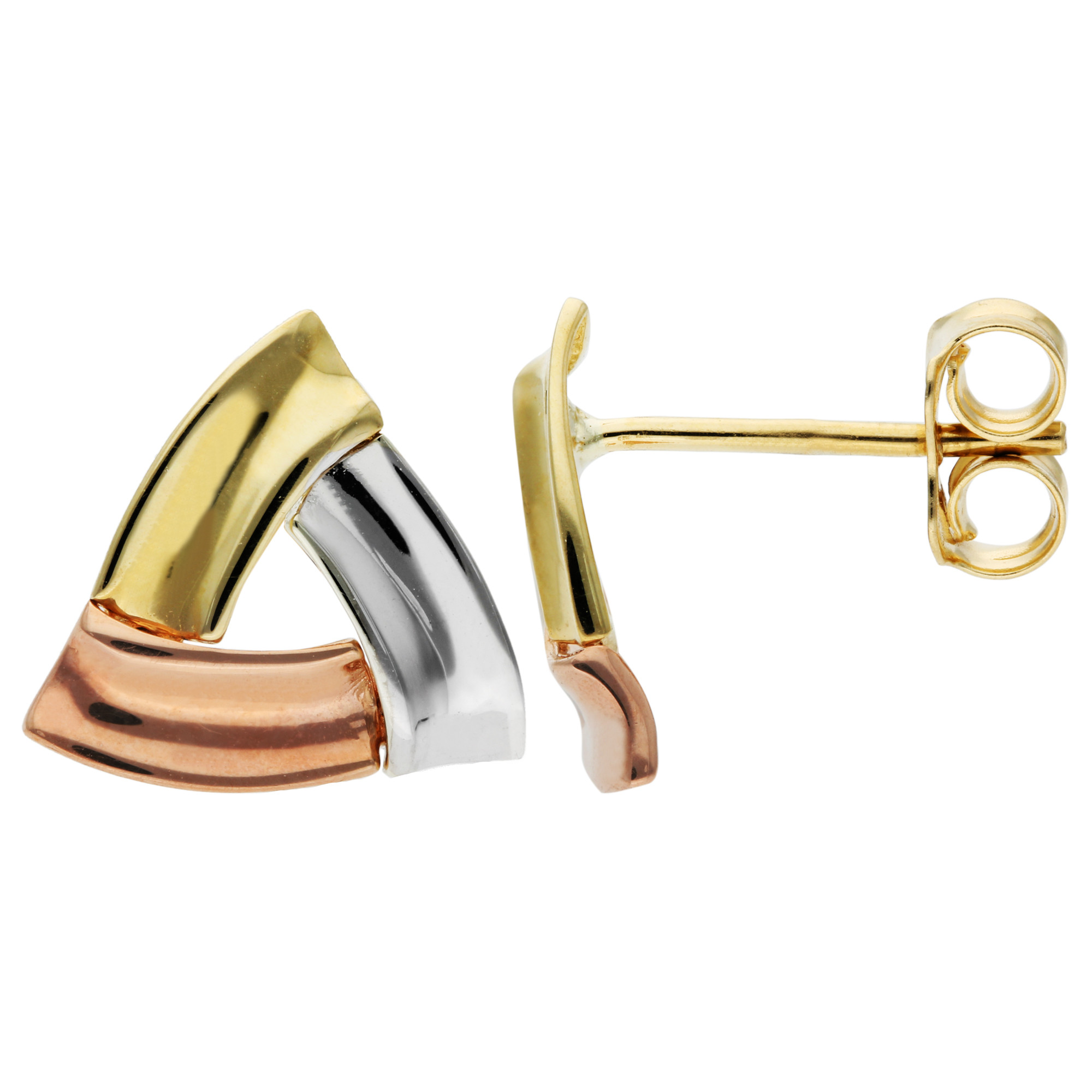 Add a touch of modern elegance to your jewellery collection with these stunning 9ct white, rose, and yellow gold stud earrings. Each earring is designed in a unique triangular shape, beautifully combining the cool tones of white gold, the warm blush of rose gold, and the classic richness of yellow gold. This harmonious blend of three precious metals creates a versatile accessory that complements any outfit, whether casual or formal. Crafted with precision, these earrings feature secure posts and scroll backs, ensuring comfort and stability throughout the day. Perfect for women who appreciate a contemporary twist on classic design, these tri-colour gold earrings are an exquisite choice for any occasion.