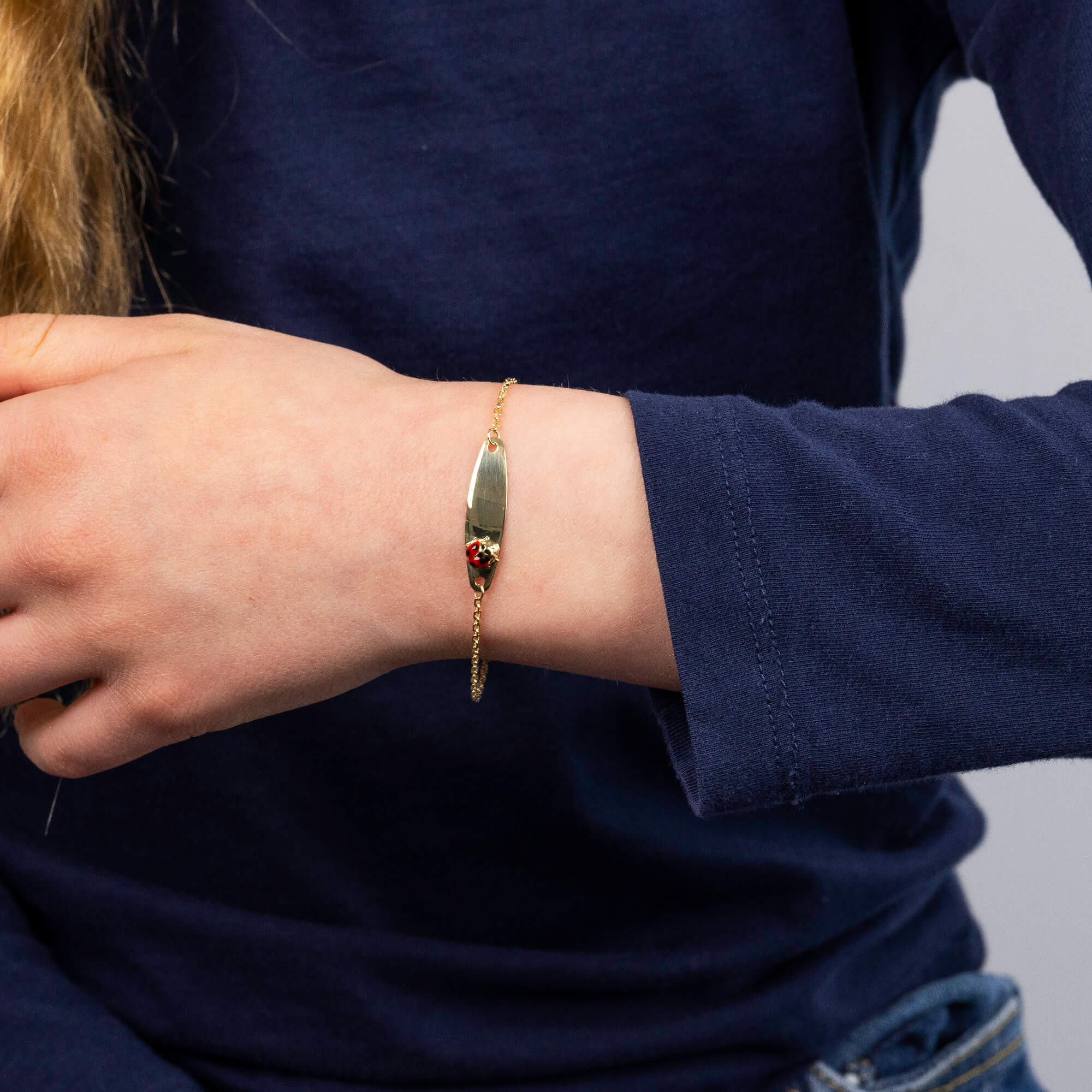 Delight in the charming elegance of this Children's 9ct Yellow Gold ID Bracelet, featuring a beautifully crafted gold plaque. This exquisite bracelet is adorned with a bright red ladybird that adds a playful touch to its classic design. The adjustable trace chain ensures a comfortable and secure fit, making it suitable for children of various ages. Ideal for personalisation, the smooth surface of the gold plaque offers the perfect canvas for engraving names or special dates, making it an unforgettable gift for birthdays, milestones, or any precious occasion.