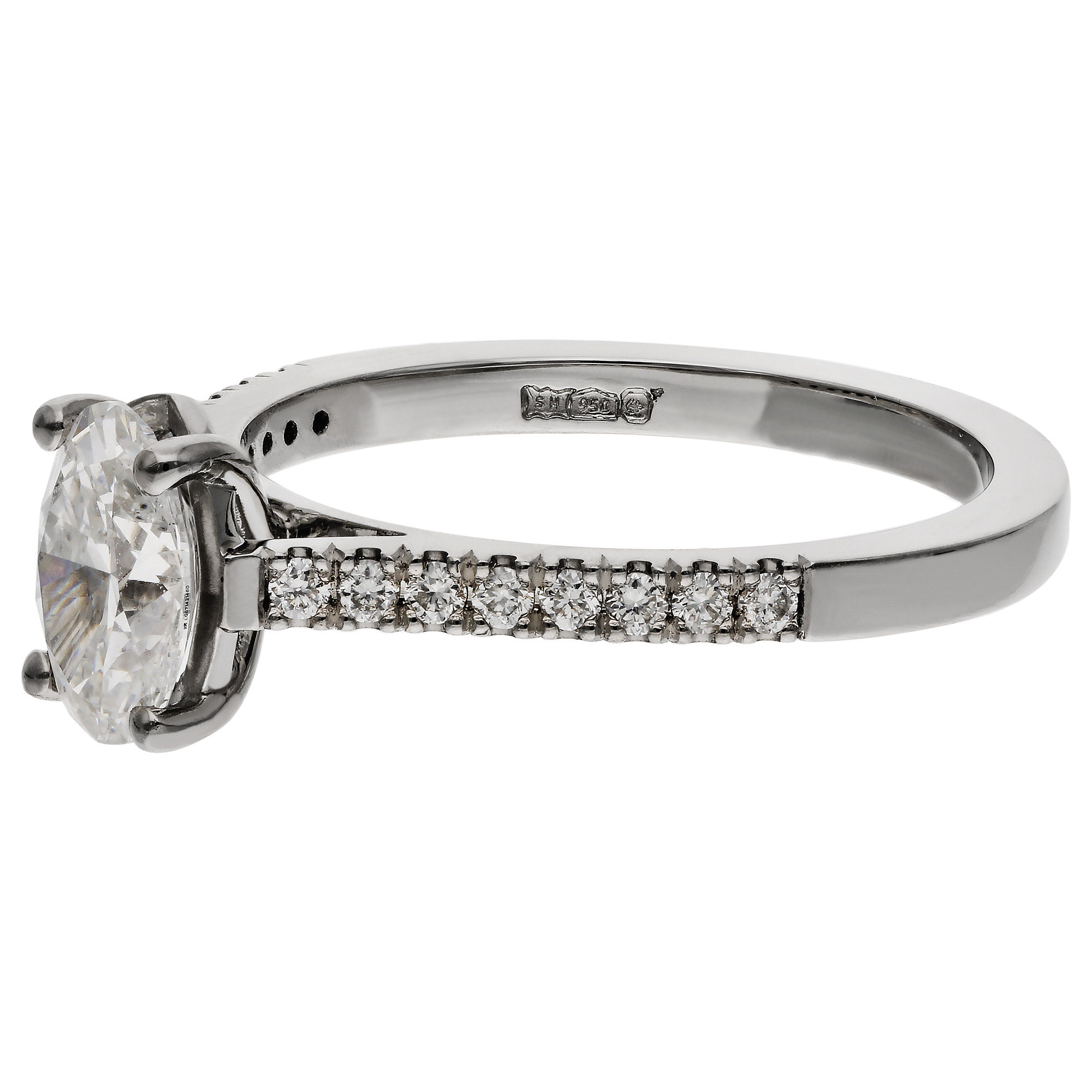 This platinum solitaire ring is a graceful choice for anyone who appreciates timeless elegance with a modern touch. At its centre sits a radiant 0.95 carat oval cut lab grown diamond, held securely in a classic claw setting that allows the light to flow beautifully through every facet. The central stone is enhanced by natural diamond set shoulders that add an understated sparkle and create an effortless sense of luxury. Crafted in platinum, the ring offers a bright and enduring finish that suits everyday wear as well as special occasions. It is an ideal gift for an anniversary, birthday or a meaningful celebration and makes a thoughtful alternative for an engagement. The combination of lab grown brilliance and natural diamonds gives this piece a unique appeal that will be cherished for years to come. Elegant, refined and beautifully made, it is designed to complement any jewellery collection.