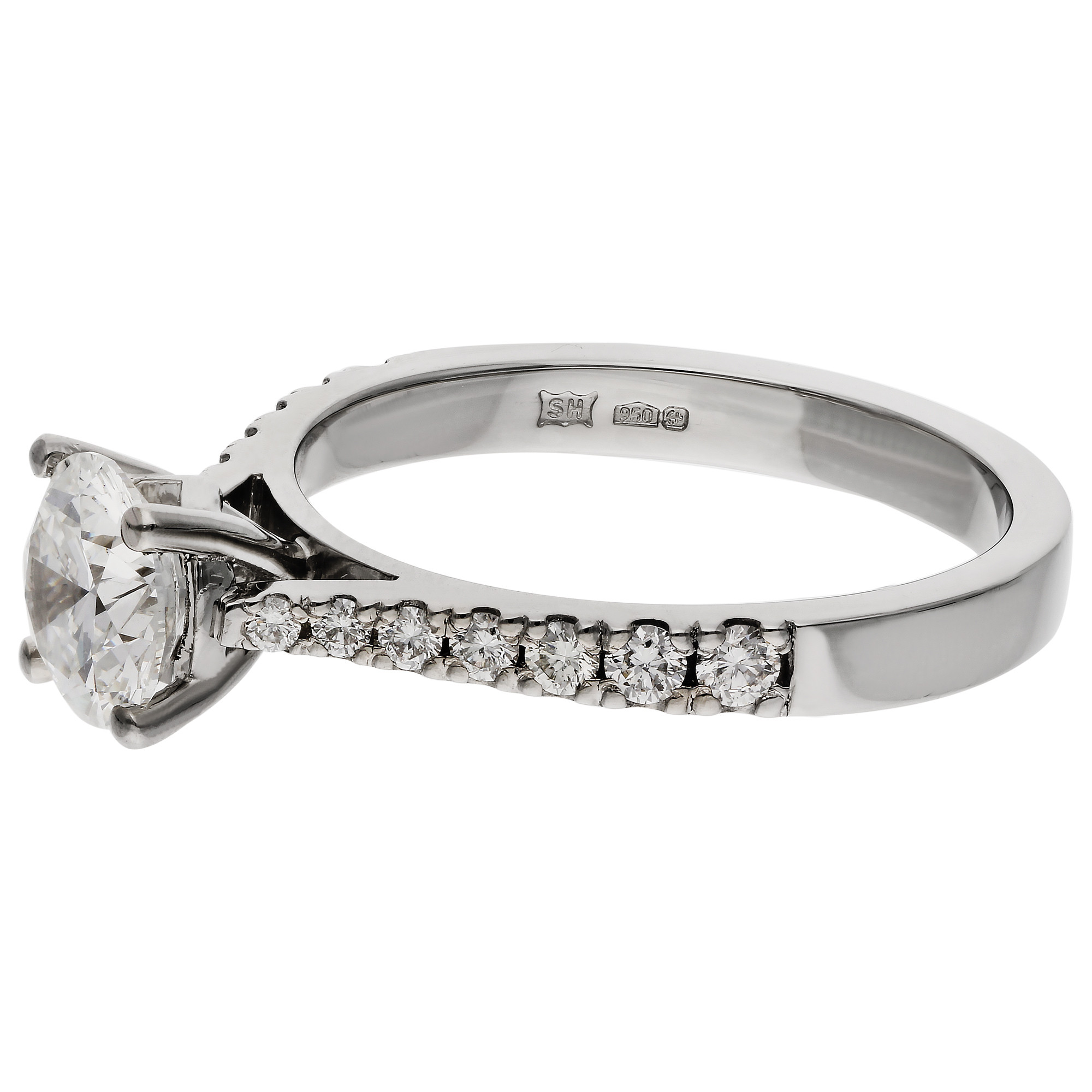 This Platinum 1.03ct Lab Grown Diamond Engagement Ring is a striking symbol of love and elegance. At its centre, a dazzling 1.03 carat round brilliant cut diamond is claw set within a V shaped bezel, a design that beautifully showcases the stone while enhancing its brilliance and sparkle. The polished platinum band features tapered pavé set diamond shoulders, adding delicate shimmer that leads the eye towards the central diamond for a harmonious and graceful silhouette. Expertly crafted, the platinum setting ensures long lasting durability and a lustrous finish that will endure for generations. The lab grown diamond delivers the same exceptional clarity, sparkle, and strength as a mined diamond, offering a sustainable and ethical choice for the modern bride. Perfect for proposals, anniversaries, or special celebrations, this elegant engagement ring combines contemporary design with timeless sophistication, making it a piece to be treasured forever.