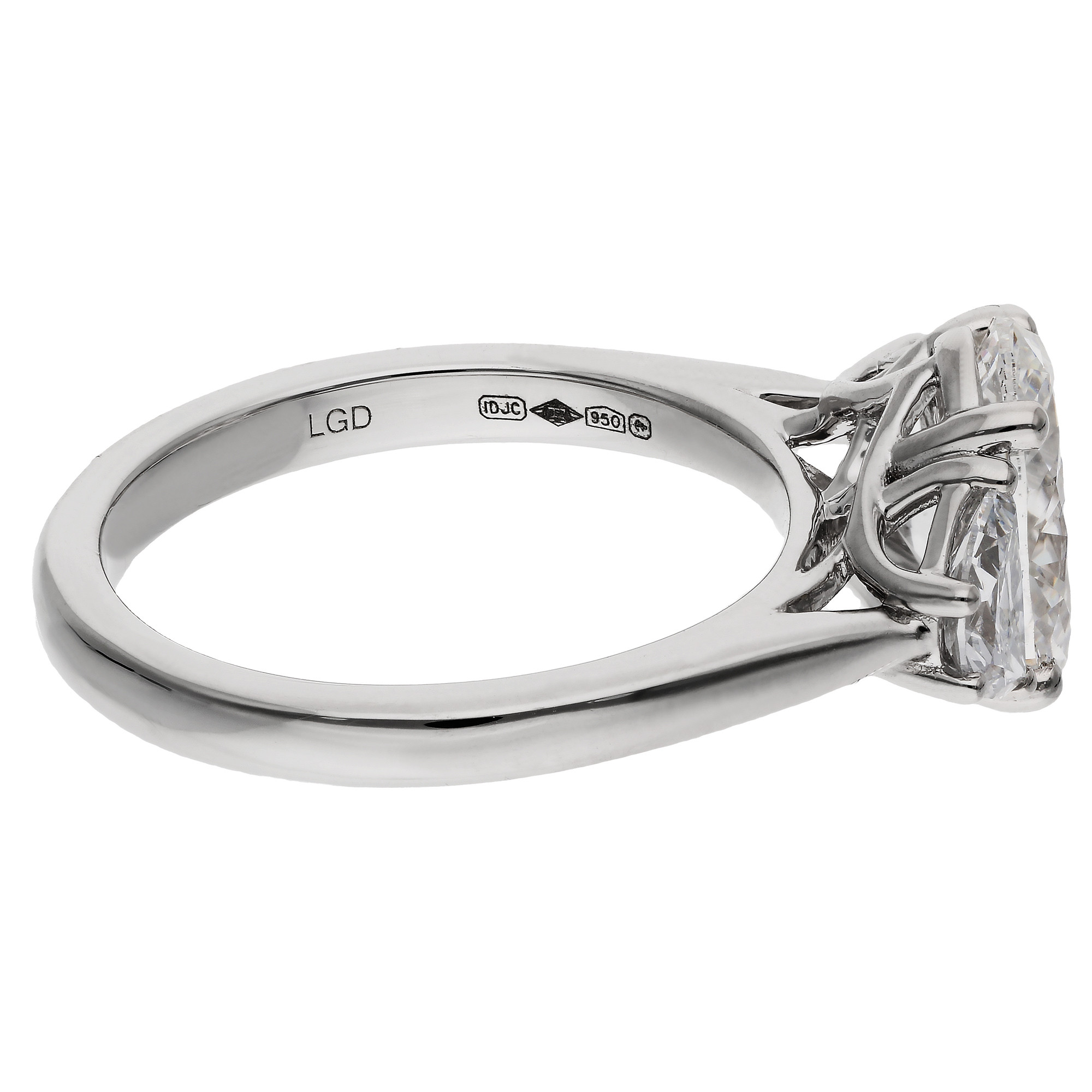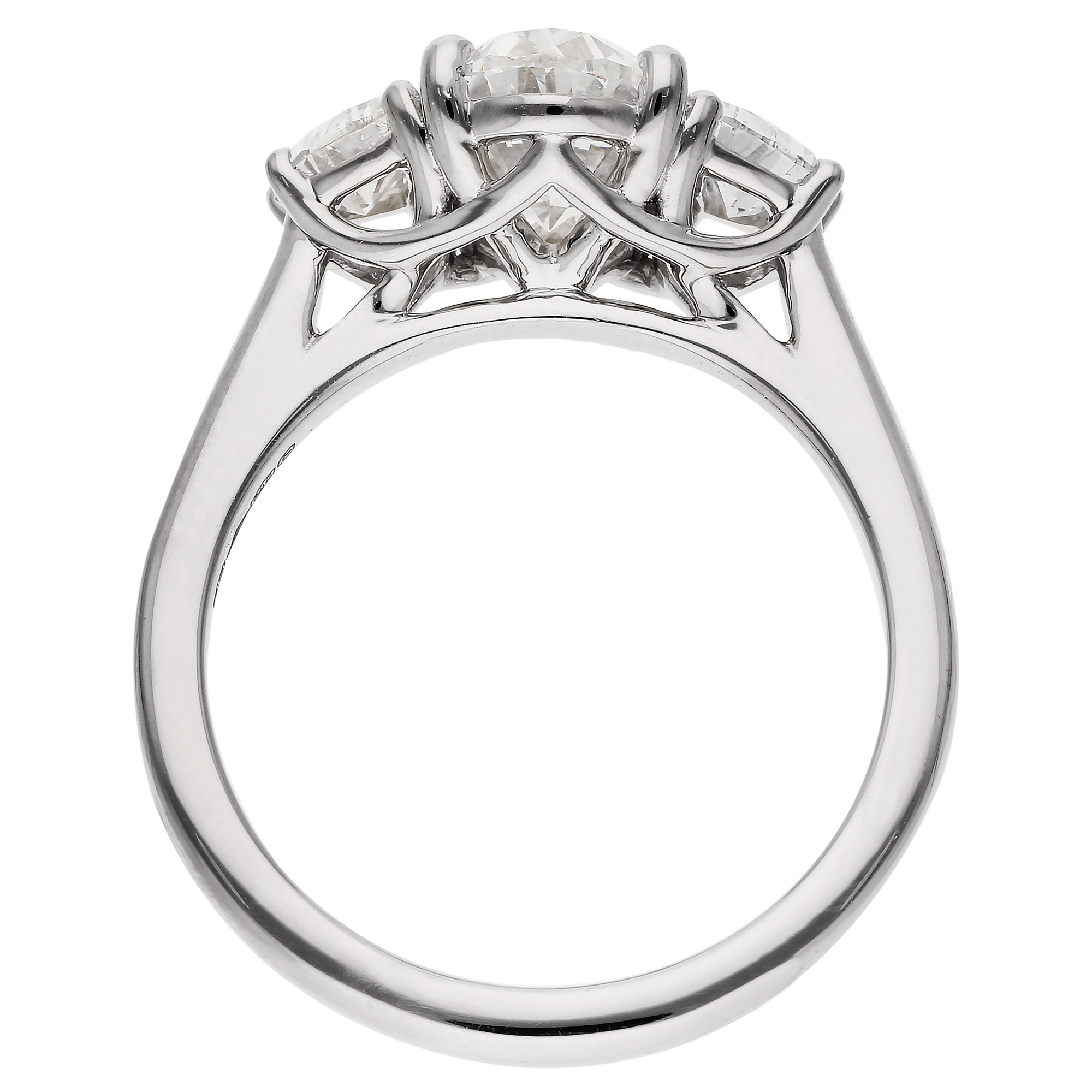 This beautiful platinum ring presents a striking display of elegance, crafted to celebrate a love story that feels truly extraordinary. At its centre sits a radiant 2.61 carat oval lab grown diamond, chosen for its captivating brilliance and modern appeal. On either side rests a graceful moon cut lab grown diamond, each one carefully selected to complement the central stone and enhance its natural sparkle. Every diamond is claw set to allow maximum light to dance across each facet, creating a look that is both refined and timeless. The smooth platinum setting offers a luxurious finish, making this ring an unforgettable choice for an engagement. Its shimmering trio of diamonds symbolises unity, devotion and the promise of a bright future. Ideal for those who value beauty, sustainability and exceptional craftsmanship, this ring delivers a sophisticated combination of contemporary style and lasting sentiment.