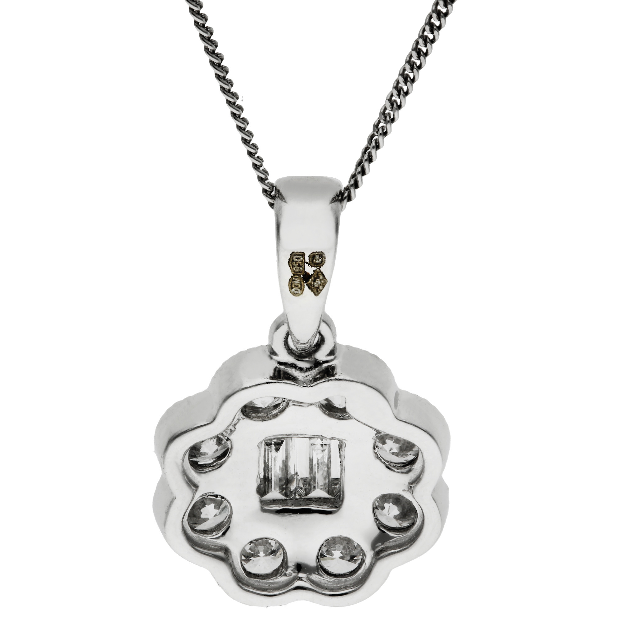 This exquisite platinum pendant showcases a stunning design centred around two baguette cut diamonds, beautifully bezel set with intricate milgrain edging. Surrounding the baguettes is a halo of sparkling round brilliant cut diamonds, claw set to enhance their brilliance. The milgrain scalloped edge adds a vintage inspired touch to this timeless piece. Suspended from a polished bail, the pendant is complete with a matching platinum chain, ensuring it sits elegantly at the neckline. The combination of platinum and diamonds offers a luxurious feel, perfect for both special occasions and everyday elegance. This diamond pendant is a statement of refined beauty, making it an ideal gift or a treasured addition to your own jewellery collection.
