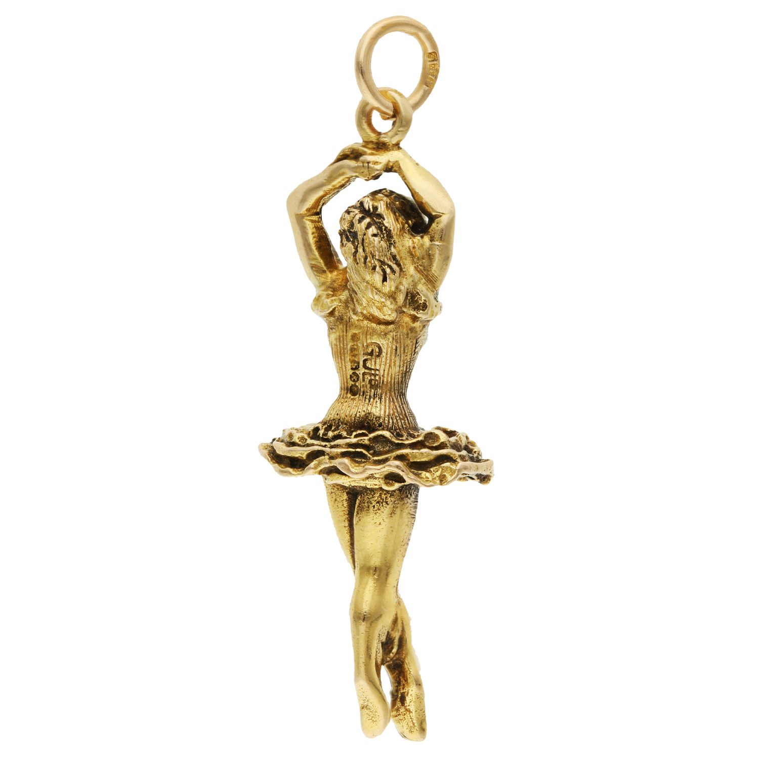 "Capture the grace and elegance of dance with our Pre-Owned 9ct Yellow Gold Ballerina Charm, a vintage treasure with a rich history. This exquisite charm, hallmarked for London 1965, is a testament to timeless craftsmanship and classic design. Crafted from 9-carat yellow gold, it features a beautifully detailed ballerina in Relevé position, a pose that conveys both strength and delicacy. The charm's intricate detailing and smooth finish highlight the dancer's poised and graceful figure, making it a perfect piece for those who appreciate the art of ballet or the beauty of vintage jewellery. The warm, golden hue of the yellow gold adds a touch of luxury and nostalgia, evoking the charm and elegance of the mid-20th century. Ideal for adding to a charm bracelet or as a standalone pendant, this Ballerina Charm is a unique and enchanting addition to any jewellery collection, sure to be cherished for its beauty and history."