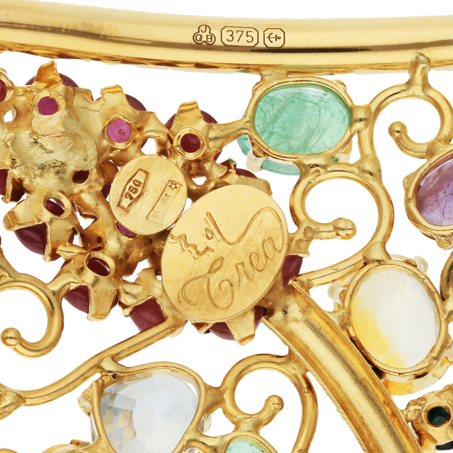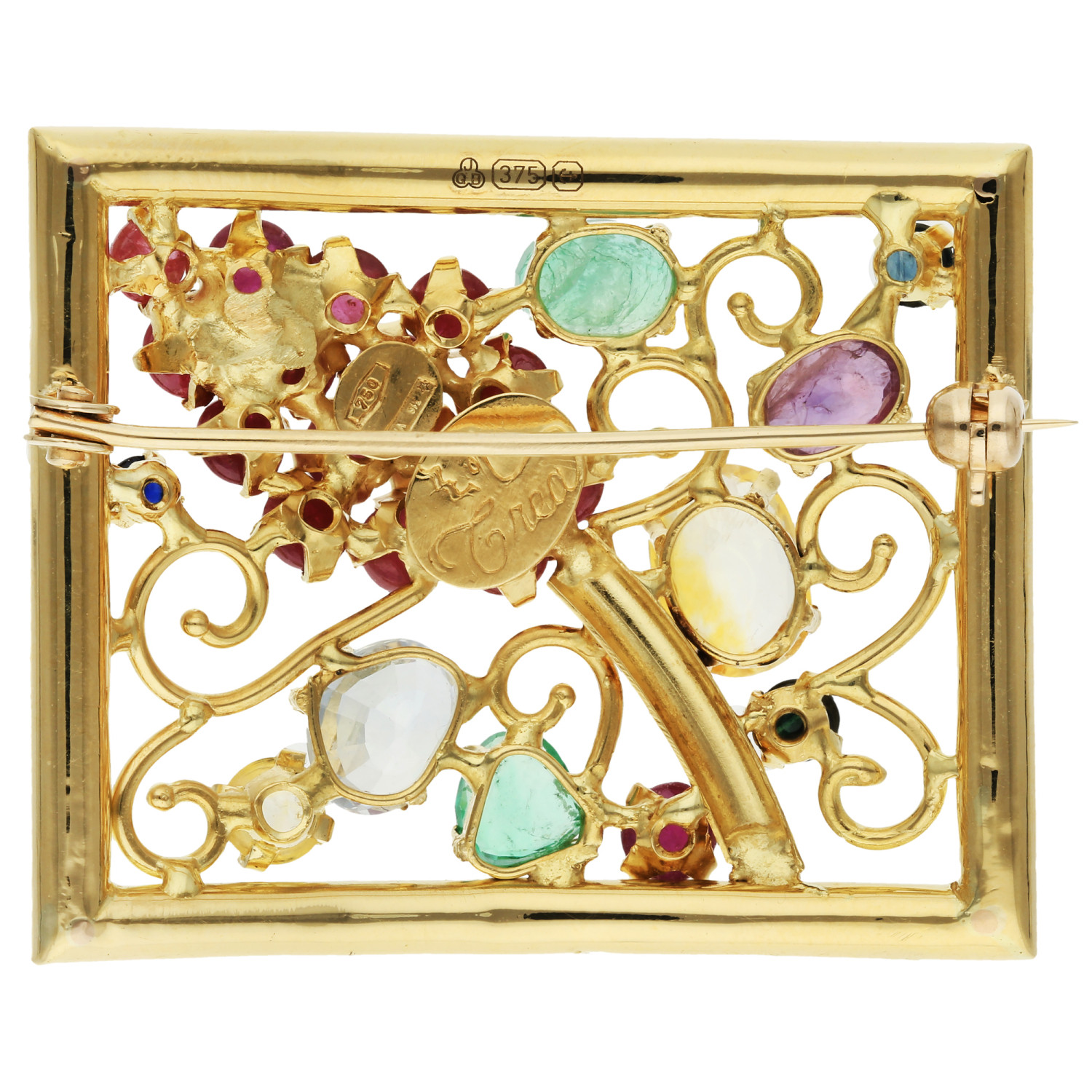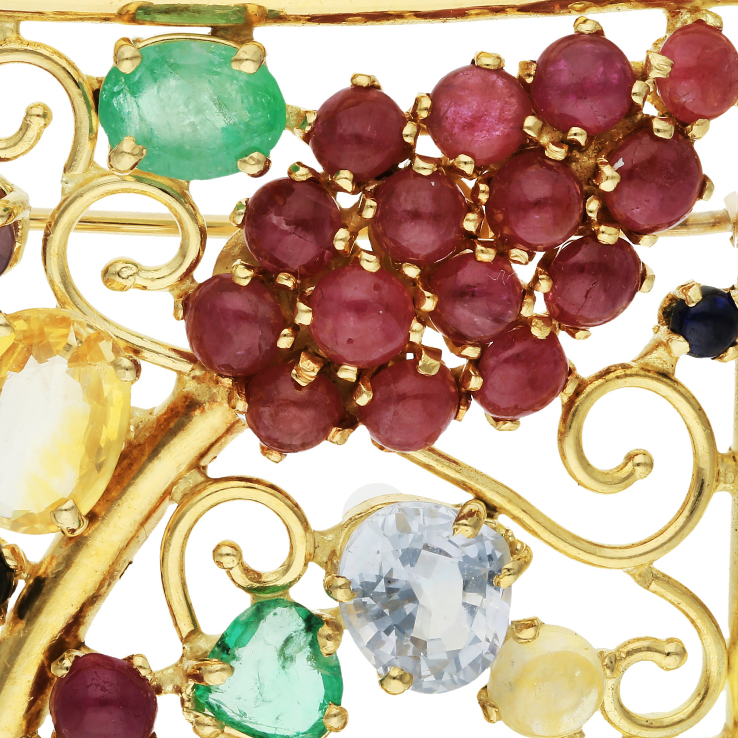 Discover the elegance of our Pre-owned Rectangular Multi Gemstone Brooch, a splendid addition to any fine jewellery collection. This exquisite piece features an open work panel adorned with a charming grapevine design, meticulously set with lustrous cabochon rubies and sapphires. The sparkle is further enhanced by faceted emeralds and sapphires in an array of captivating colours, creating a visual feast. Crafted in luxurious 18kt gold that forms the body, this brooch boasts later additions of 9ct gold fittings, blending classic allure with modern craftsmanship. Perfect for sophisticated ensembles and special occasions, this brooch is a testament to timeless style and opulence. Add this unique gemstone brooch to your collection and embody the grace of vintage luxury.
