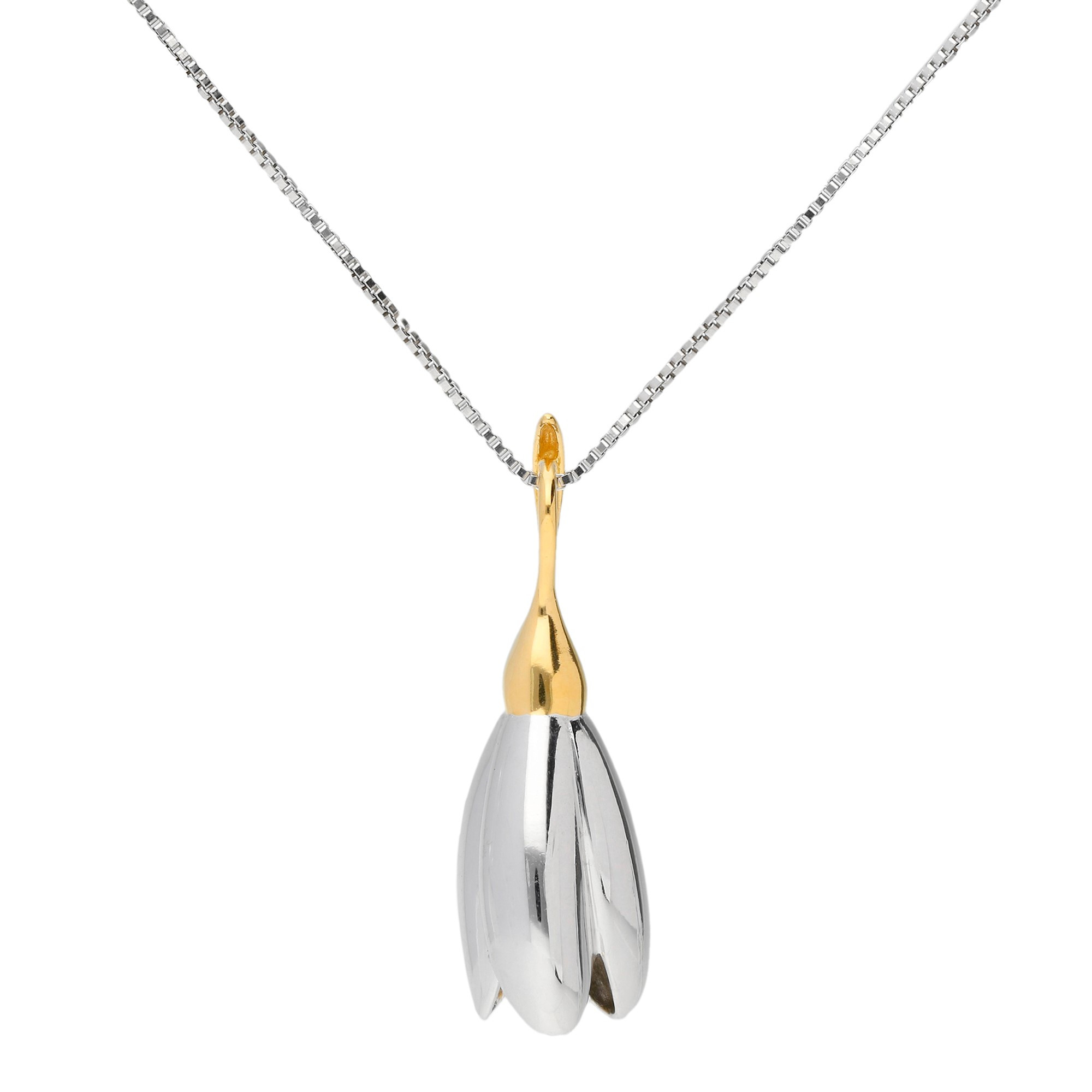 Celebrate the beauty of new beginnings with this elegant Gold Plated Sterling Silver Snowdrop Pendant. Delicately crafted, the pendant features a sterling silver snowdrop design, enhanced with a gold plated stem and inner sepals for a striking contrast. This charming piece is accompanied by an adjustable chain, allowing you to customise the length between 16 and 18 inches for a perfect fit.