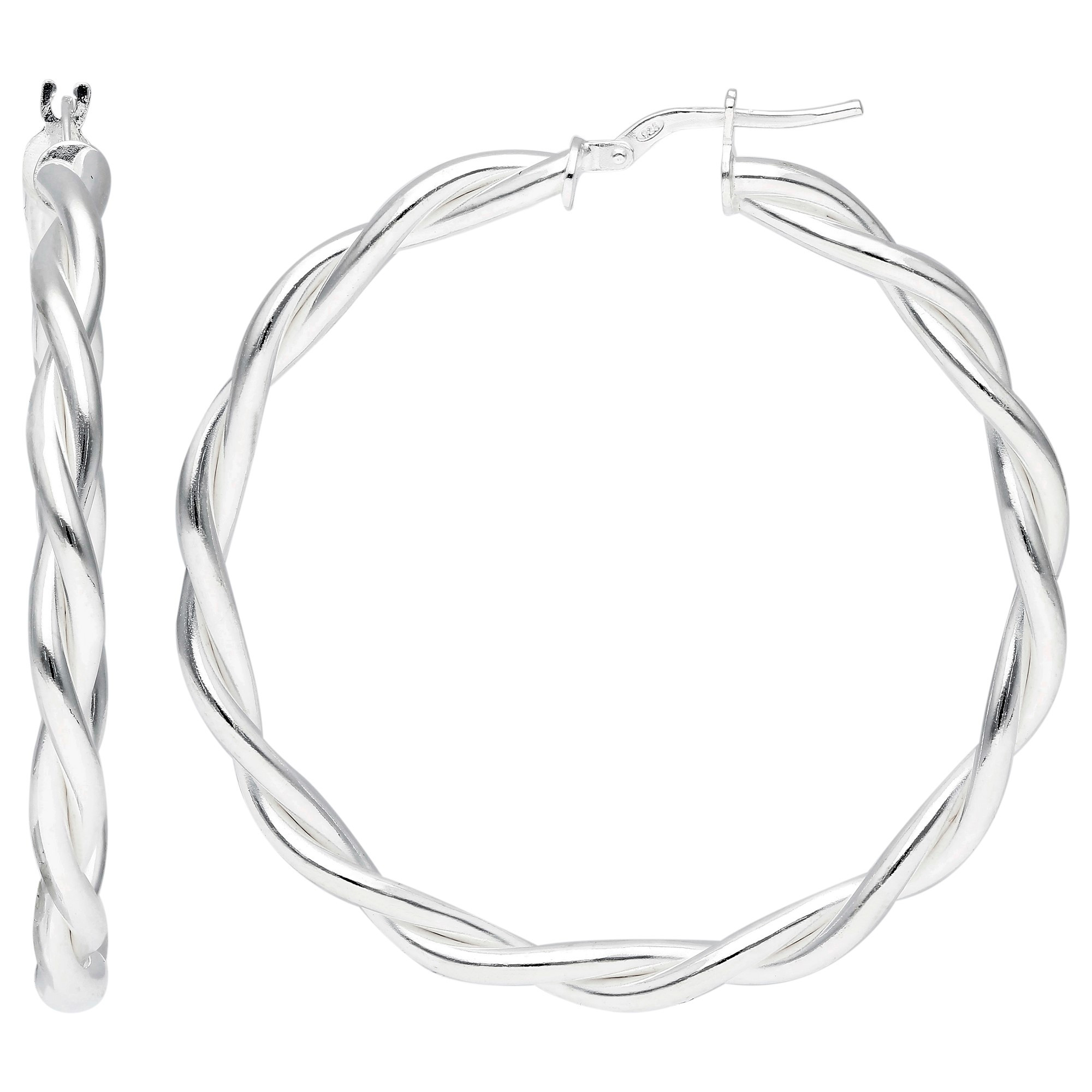 Step up your style game with our striking 47mm sterling silver hoop earrings, designed as two thick bands of silver elegantly twisted together. These large hoop earrings make a bold fashion statement, adding a touch of drama and sophistication to any ensemble. Crafted from high quality sterling silver, they boast a brilliant shine that captures attention from every angle. The lever clasp fastenings ensure these earrings are not only stylish but also secure and comfortable for all-day wear. Perfect for elevating your evening attire or adding some flair to a casual look, these hoops are a versatile addition to any jewellery collection.