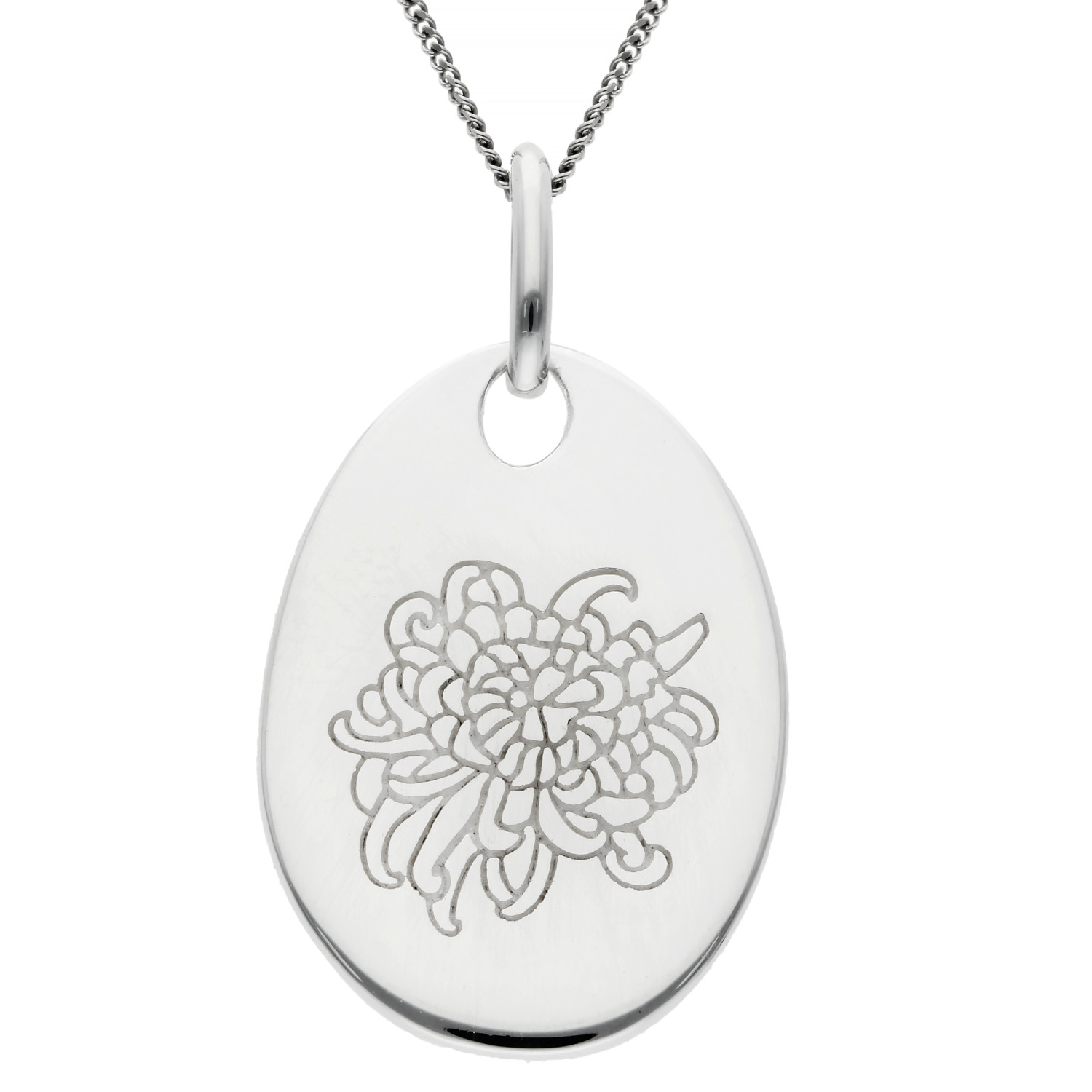Celebrate the beauty of November with this Sterling Silver Chrysanthemum Birth Bloom Pendant. Crafted from recycled sterling silver, this elegant tag pendant features a pre-engraved chrysanthemum motif, symbolising joy, optimism, and longevity. The design highlights the essence of the birth flower for November, making it a thoughtful and personal gift.