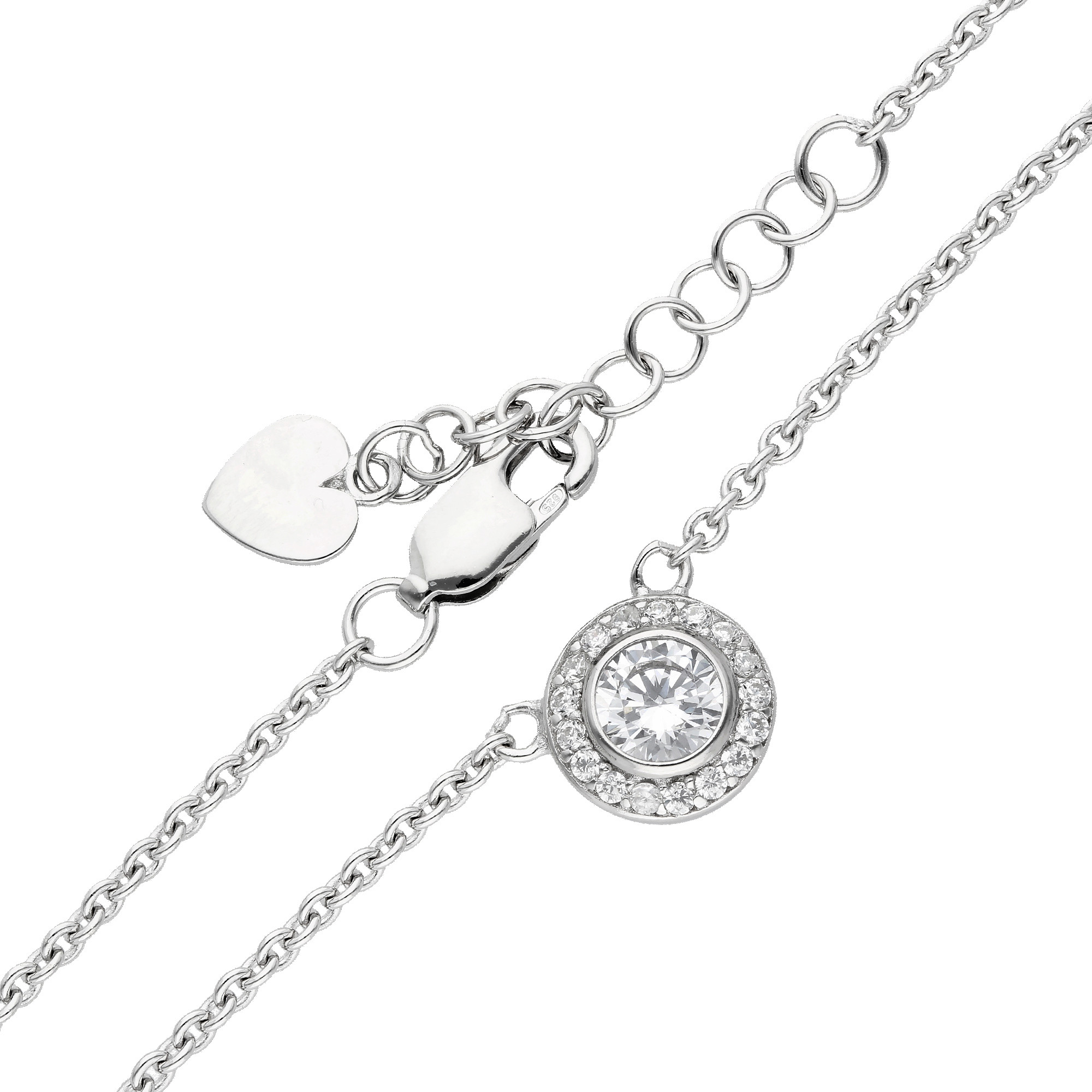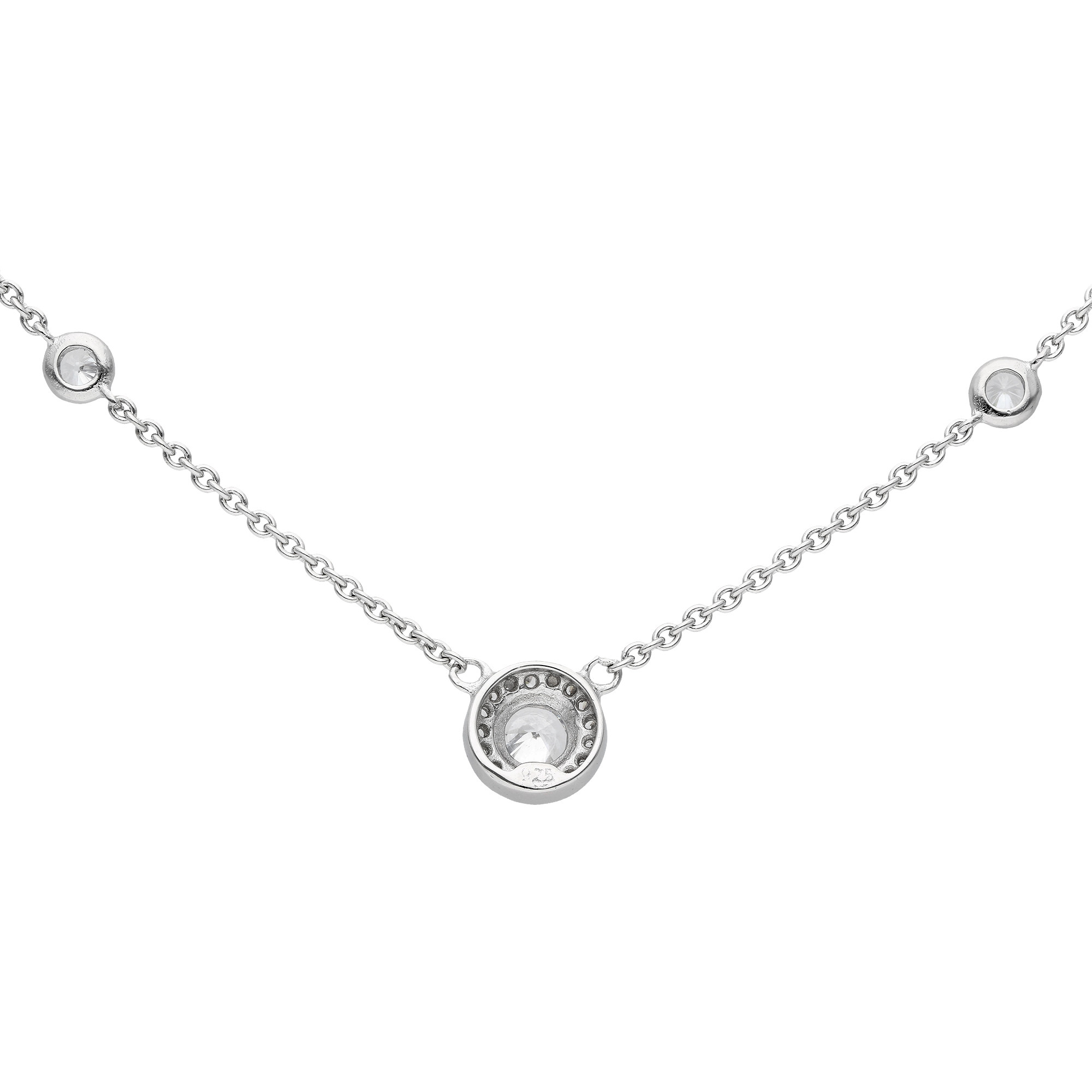 Enhance your jewellery collection with this dazzling Cubic Zirconia and Sterling Silver Necklace. Crafted with sophistication, this necklace features a stunning central halo of sparkling cubic zirconias as its focal point. On either side, spaced delicately further up the adjustable chain, sit two smaller bezel set round cubic zirconias, adding an extra layer of brilliance to the design.
