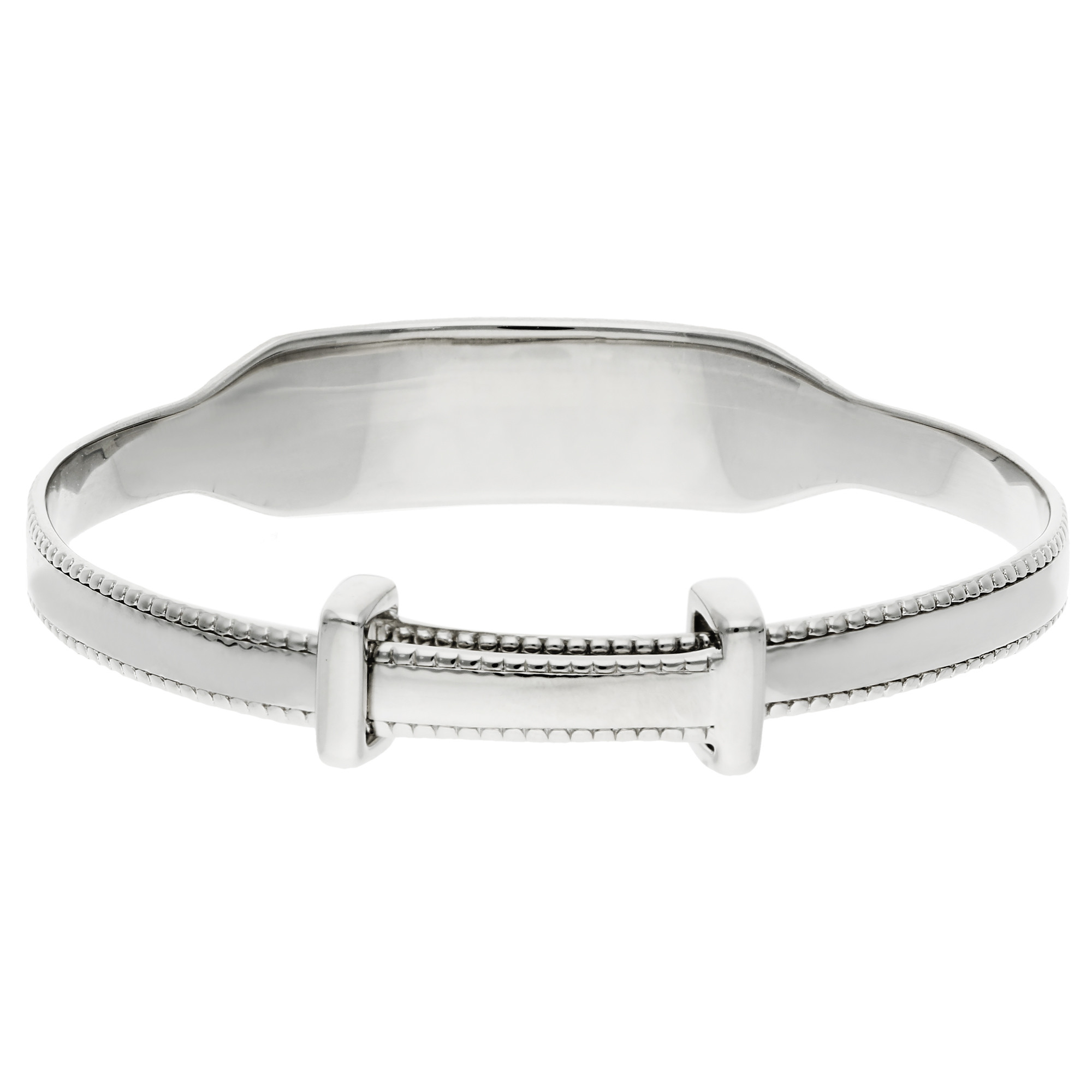 Introduce a touch of sparkle to your little one's wardrobe with our sterling silver children's bangle, designed to capture hearts with its charming details. This exquisite piece features a delicate yet durable expandable design, perfect for growing wrists, ensuring a comfortable fit as they grow. The bangle boasts a smooth panel ideal for engraving a special name, date, or message, making it an unforgettable gift for any occasion. Tucked neatly in the corner of the panel is a tiny accent diamond that adds a subtle shimmer, enhancing the bangle's elegance. Whether it's a birthday, christening, or a special milestone, this sterling silver bangle with its unique personalisation option and sparkling diamond accent is the perfect keepsake that will be treasured for years to come. Crafted with care and designed to delight, it's an ideal way to celebrate the little joys and big moments in your child's life.