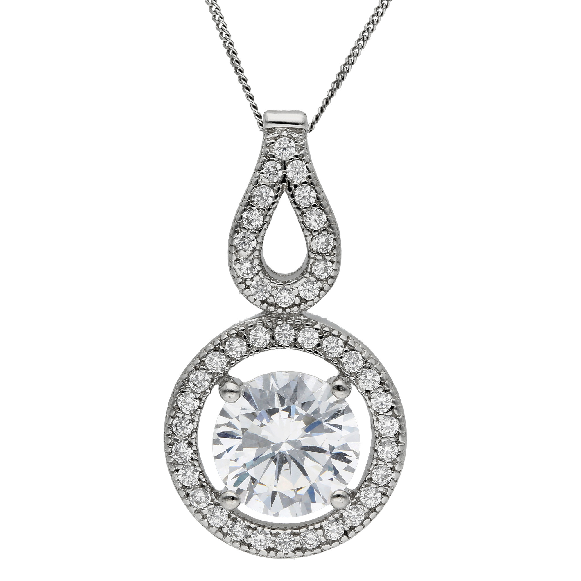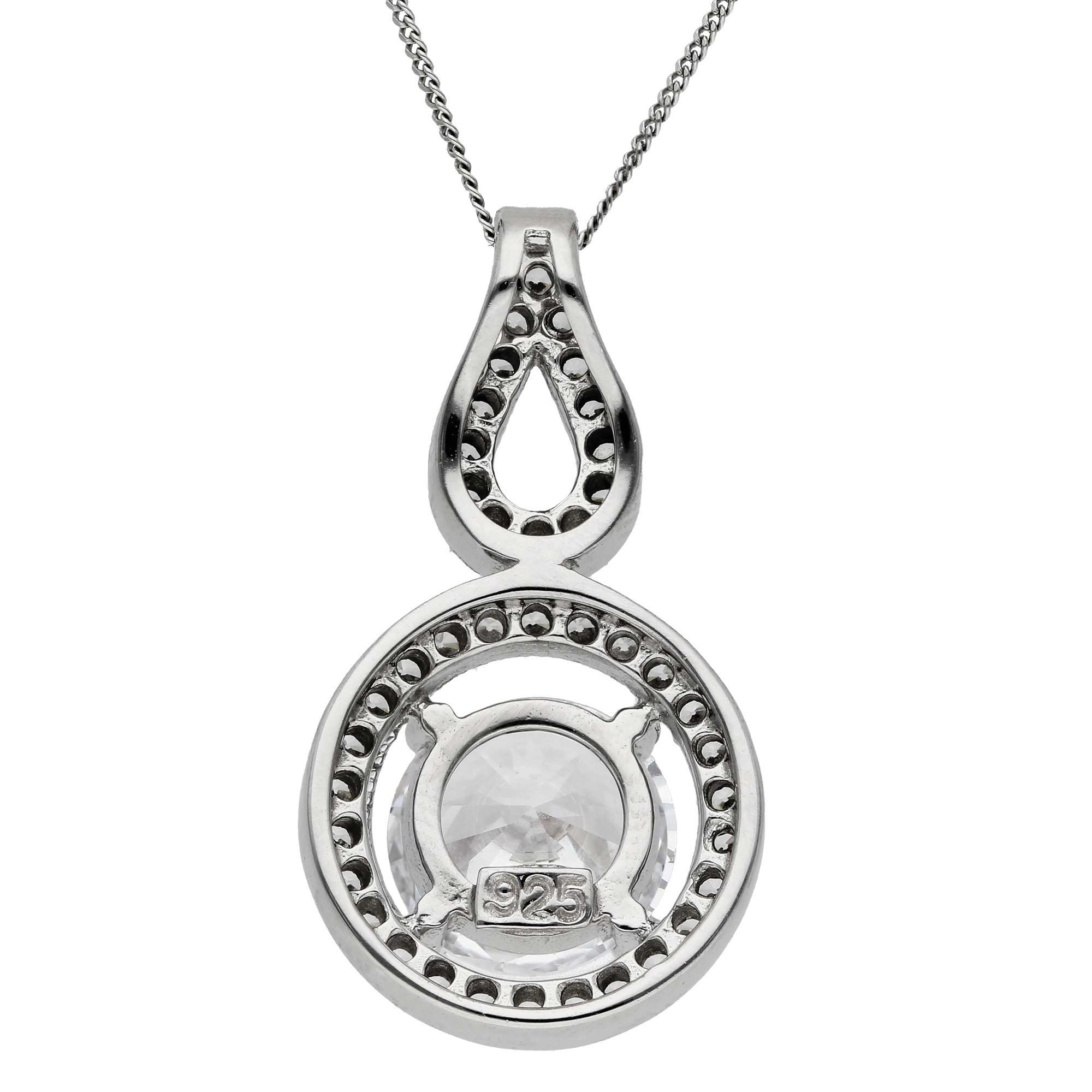 Elevate your jewellery collection with this stunning Cubic Zirconia & Sterling Silver Pendant, a true showcase of sparkle and sophistication. At its centre is a dazzling round faceted cubic zirconia, claw set in sterling silver and encircled by a halo of tiny cubic zirconias for extra brilliance. The pendant is suspended from an elegant teardrop shaped surmount, also adorned with sparkling cubic zirconias, adding a touch of glamour to this timeless design.