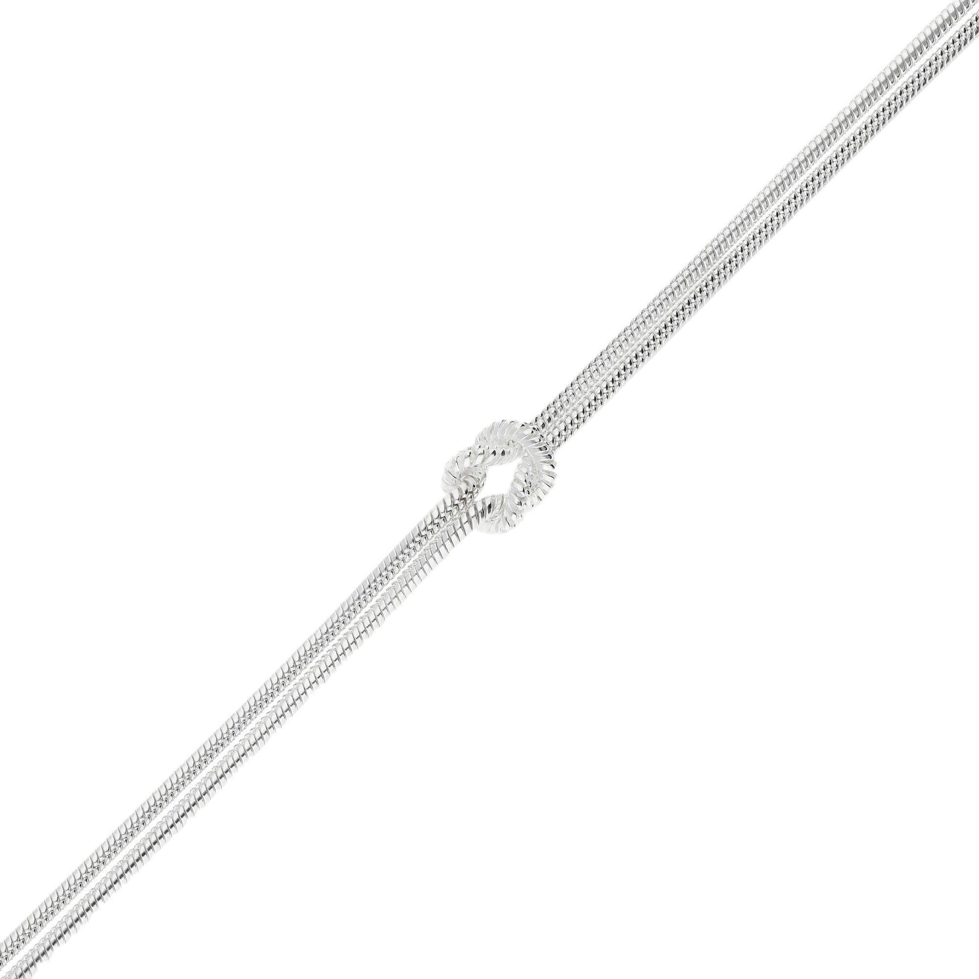 Add a sleek and meaningful touch to your jewellery collection with this sterling silver double snake chain bracelet. Crafted with two fluid snake chains that meet in the centre to form an elegant love knot, this design symbolises unity, affection and connection. The bracelet is finished with a secure lobster clasp for comfortable everyday wear.