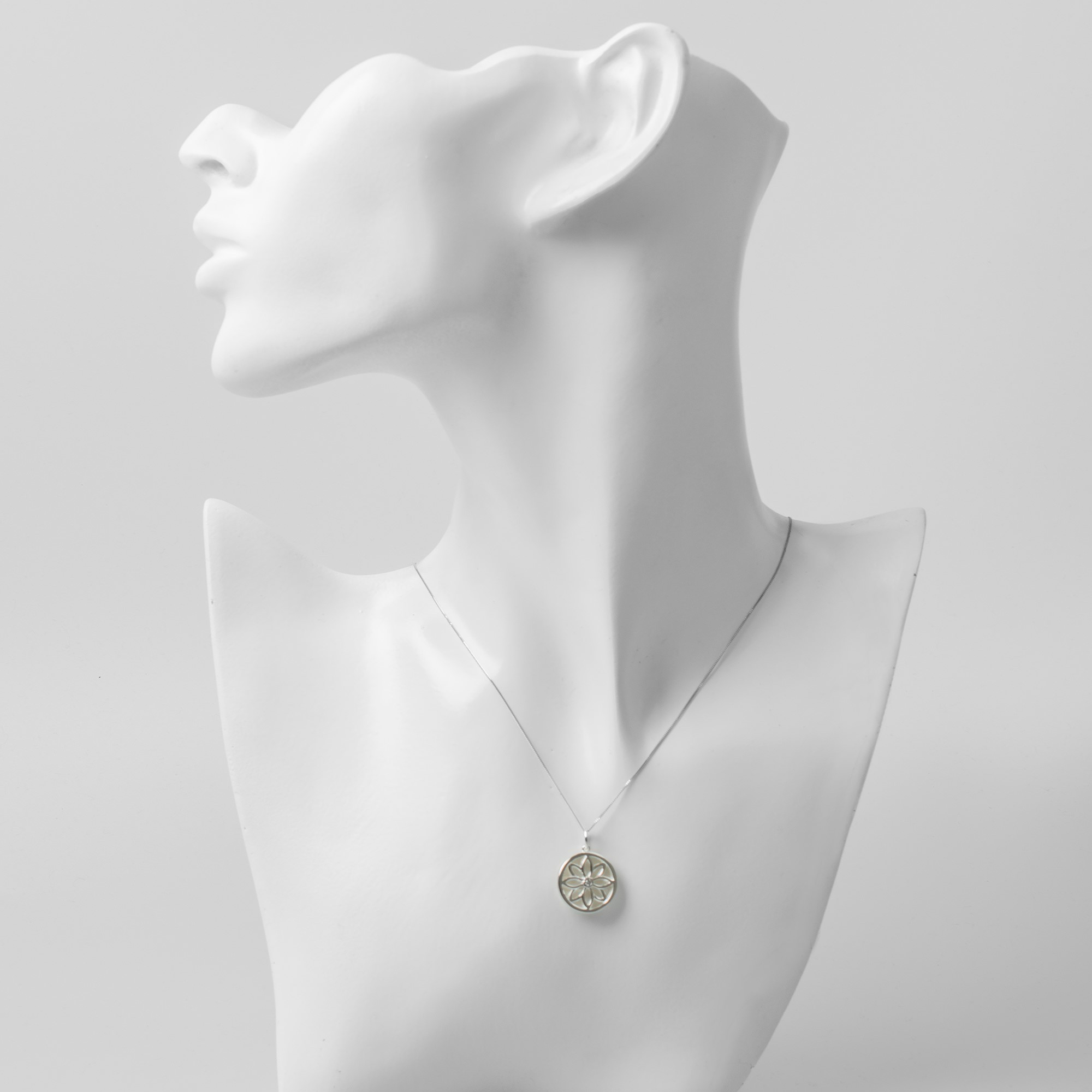 The circular pendant is held on a sleek polished bail, creating a seamless and sophisticated finish. It is accompanied by a sterling silver chain, allowing you to choose the perfect length from the dropdown menu. Ideal for both everyday wear and special occasions, this pendant offers a combination of understated charm and refined beauty.