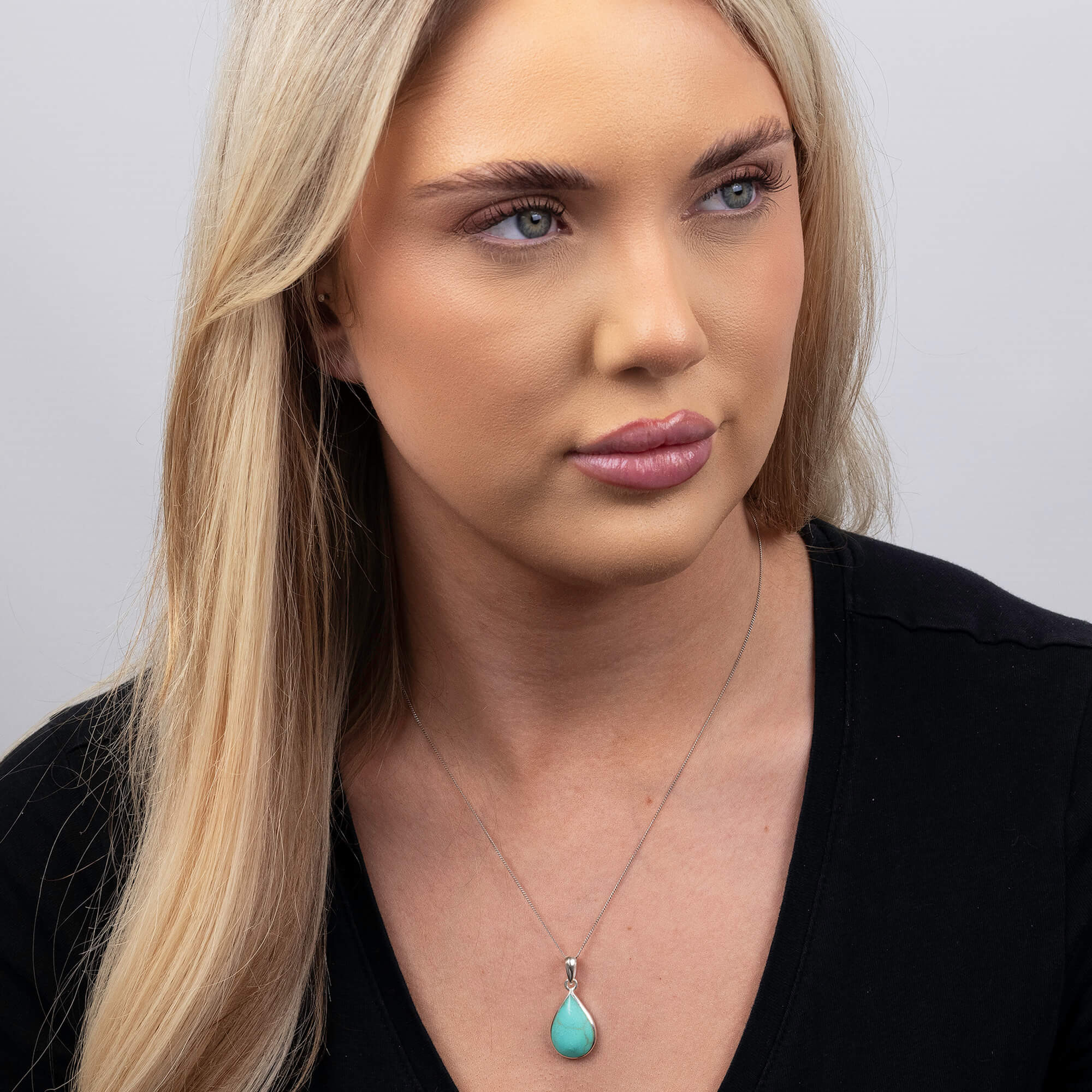 Introducing our exquisite Sterling Silver Turquoise Pendant, a captivating addition to any jewellery collection. This pendant features a pear shaped turquoise cabochon, meticulously set in polished sterling silver. The vibrant, sky blue hue of the turquoise contrasts beautifully against the silver, evoking images of serene landscapes and clear skies.